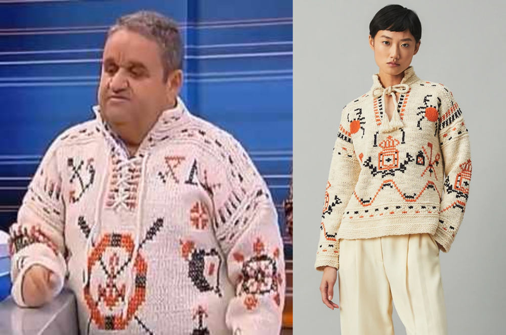 토리 버치에서 공개한 것은 튜닉 스타일의 스웨터였습니다. 이 스웨터에는 기하학무늬의 자수가 검은색, 그리고 오렌지색으로 놓여져 있었죠. 에스닉한 분위기의 이 스웨터는 따뜻한 색감과 빈티지한 매력으로 많은 사람들의 이목을 끌었는데요. 그러나 이 스웨터는 곧 논란의 중심에 놓였습니다. 바로 이 디자인은 다른 나라의 전통 의상과 쏙 빼닮아 있었기 때문입니다.