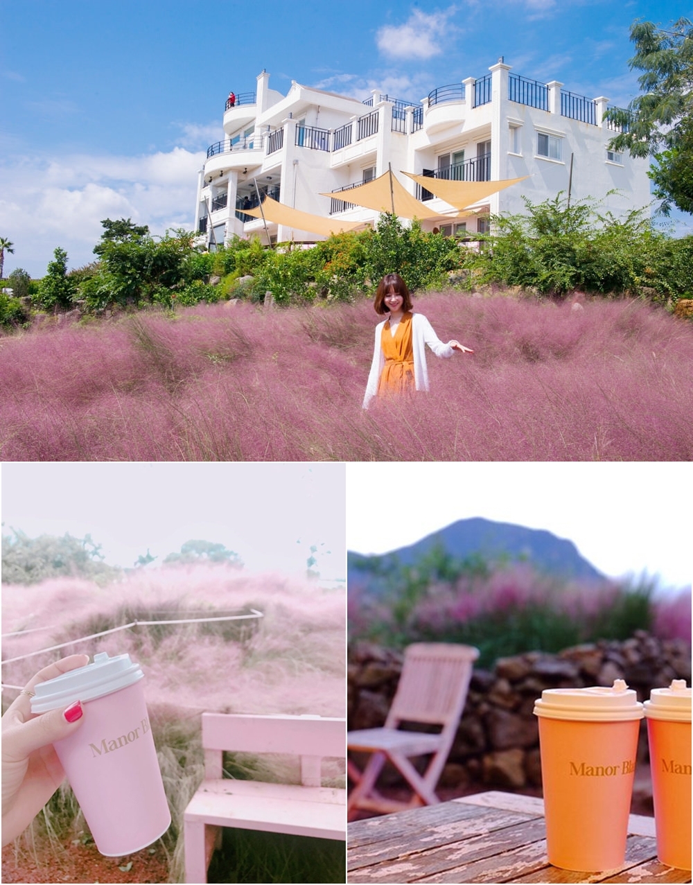 음료도 마시고 꽃도 볼 수 있는 카페인 마노르 블랑. 이곳에서는 산방산을 볼 수 있습니다. 오션뷰가 아닌 카페를 찾는다면 좋은 선택이 될 것 같네요. 이곳은 실내도 멋지지만 외부 정원 역시 인기 만점인데요. 이 정원에서는 산방산과 오름의 풍경을 만끽할 수 있습니다. 이곳은 초여름에는 수국, 가을이 되면 핑크 뮬리, 겨울이 되면 동백꽃을 볼 수 있는데요. 멋진 풍경에 많은 관광객들이 찾는 곳입니다.