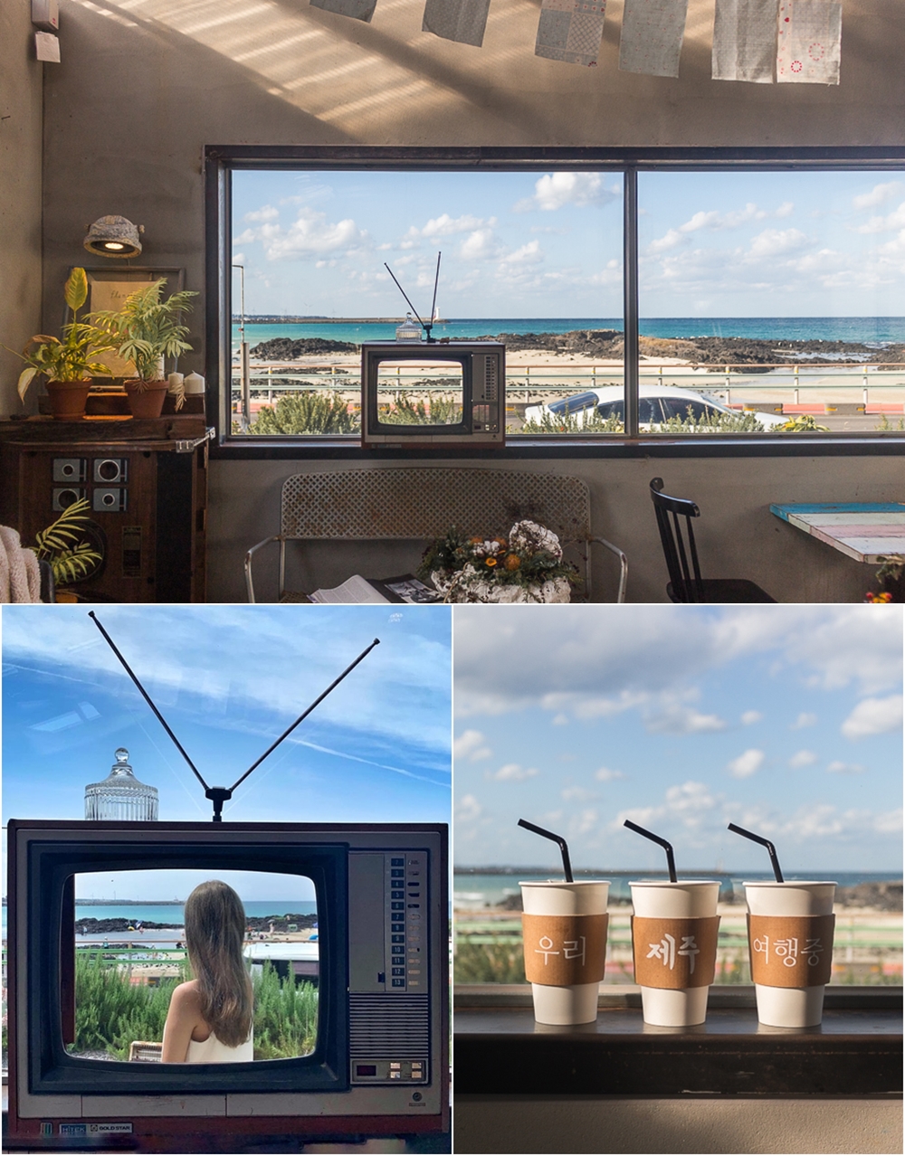 이 카페는 세화 해수욕장 바로 앞에 위치해 있습니다. 이곳의 포토존은 뭐니 뭐니 해도 TV에 나오는 것처럼 찍는 사진이죠. 이곳은 빈티지한 감성의 인테리어로 아기자기한 분위가 특징적인 곳입니다. 이곳은 이름과는 달리 한라산은 보이지 않는다고 하니 참고해야 할 것 같습니다.
