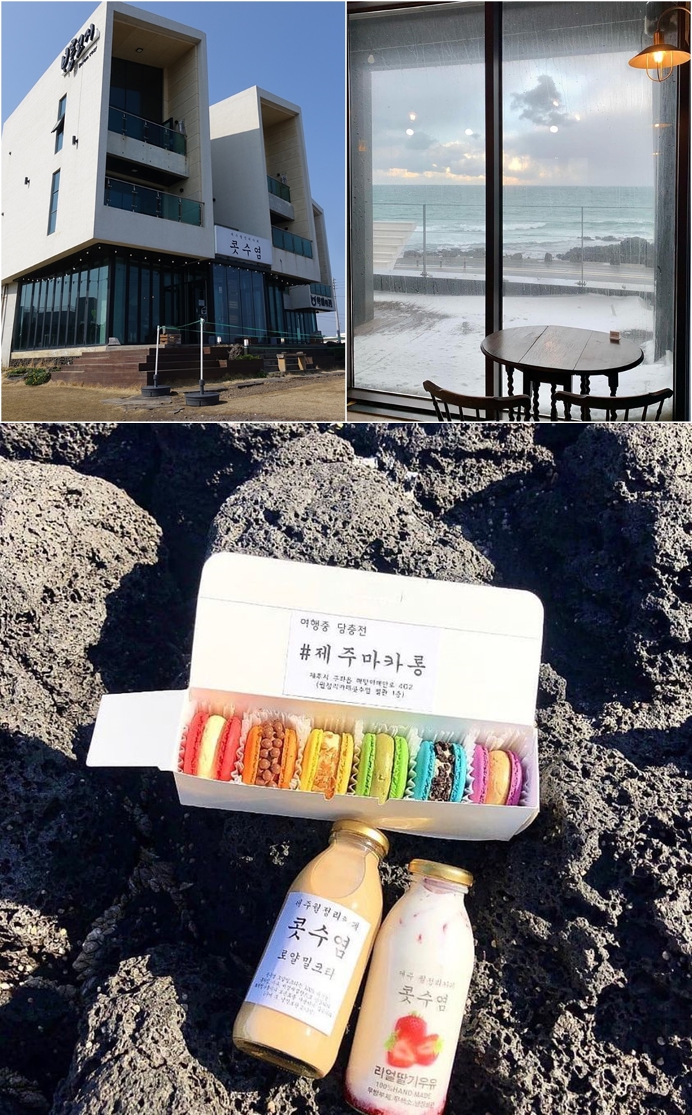 월정리 해변 앞에 위치하고 있는 카페 콧수염은 에메랄드빛 해변과 보고만 있어도 마음이 편안해지는 파도로 유명한 곳입니다. 이곳은 총 세 개의 층으로 이루어져 있는데요. 층별 실내 디자인이 모두 다르며 테이블 곳곳이 각양각색의 디자인으로 연출되어 있습니다. 온돌형 테이블, 반려견 동반 장소, 하늘을 향해 설치된 계단 조형물 등이 눈에 띄네요. 이곳의 시그니처 메뉴는 마카롱과 딸기우유입니다.