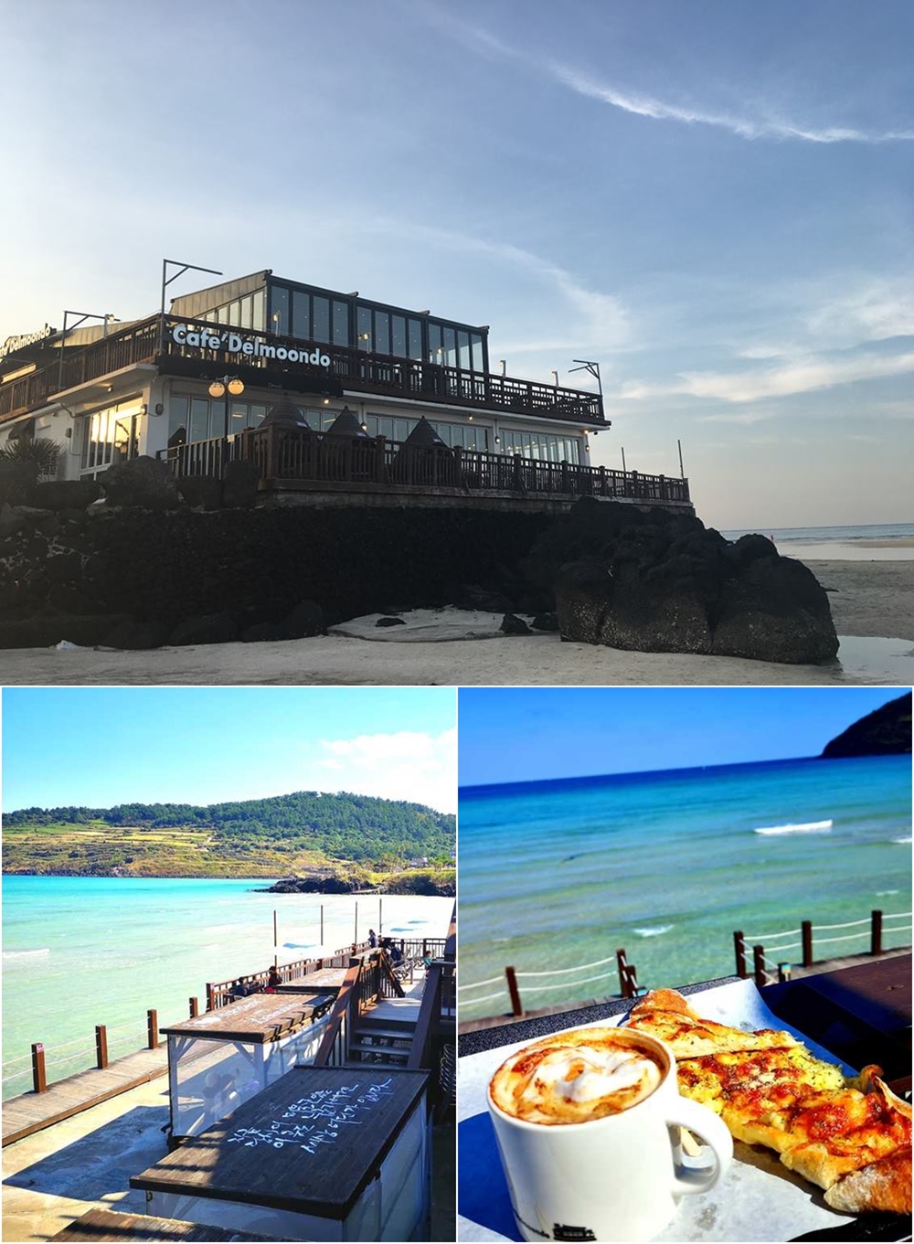 함덕해변 바로 앞에 위치하고 있는 카페 델문도는 멋진 해변뷰의 카페입니다. 이곳은 실내 좌석보다 실외의 테라스 좌석이 유행인데요. 왼쪽으로는 작은 섬이, 오른쪽으로는 서우봉이 펼쳐지며 함덕 해변의 에메랄드 바다가 펼쳐지는 멋진 뷰로 많은 사람들의 마음을 사로잡고 있습니다.