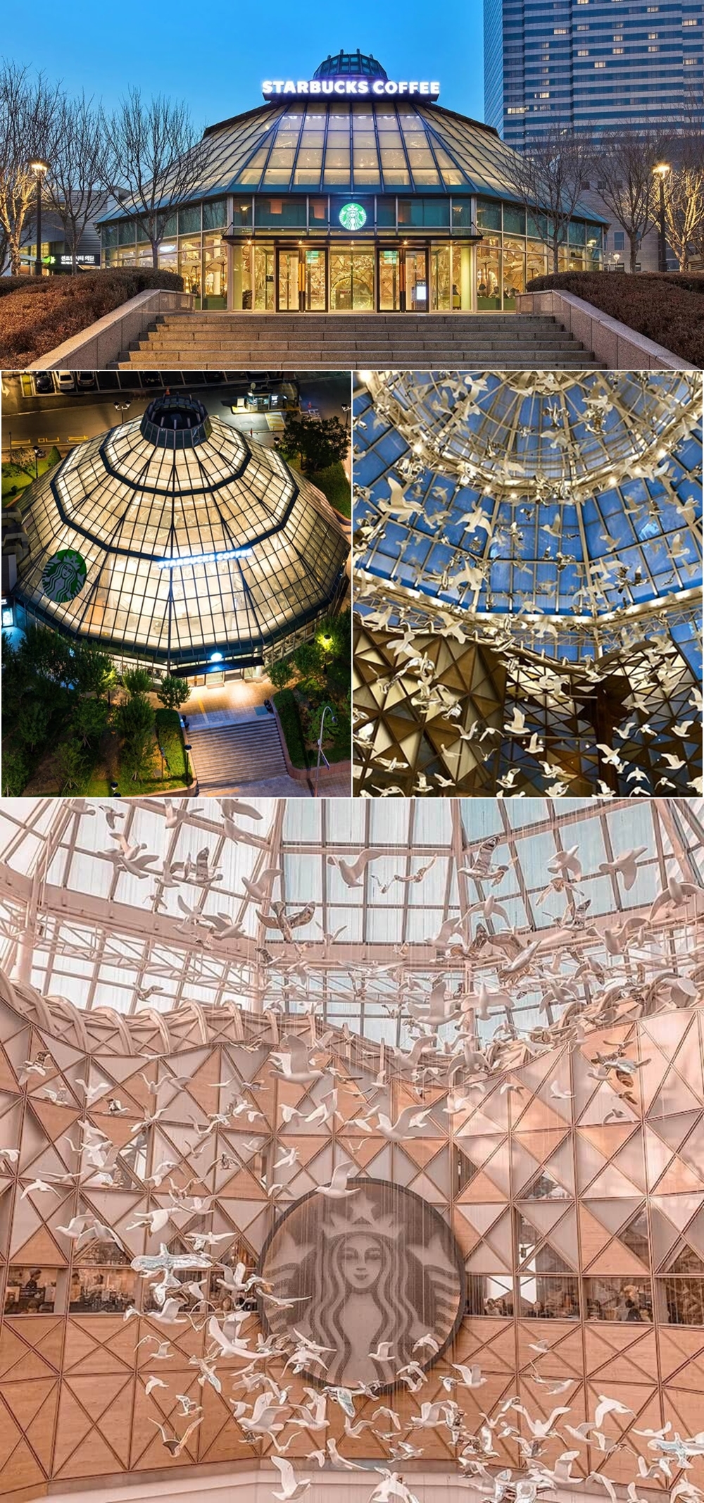 파미에파크의 시그니처 인테리어는 바로 새 모형이 유리 돔으로 된 천장을 향해 날아가는 듯한 모습입니다. 마치 동화 속의 한 장면 같은 이 인테리어로 인해 아마 스타벅스 로고를 못봤다면 스타벅스라고 상상하기 조차 어려울 것 같습니다. 이 매장은 한국에서 오픈한 800번째 매장이라고 하는데요. '도심의 커피 숲'이라는 콘셉트로 자연친화적인 소재를 사용해 창의적이고 세련된 모습의 공간이 탄생했습니다. 외부는 기하학적 구조로 되어 있어 더욱 독특함을 더하고 있습니다.