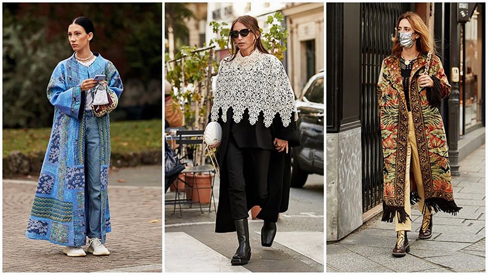 토속적인 전통에서 영감을 받은 민속적인 코트 또한 2021년의 유행 트렌드입니다. 이 디자인의 코트에는 섬세한 자수와 레이스가 달려있는 것이 특징이며 반복되는 무늬로 체형을 커버할 수 있는 디자인이기도 하죠.