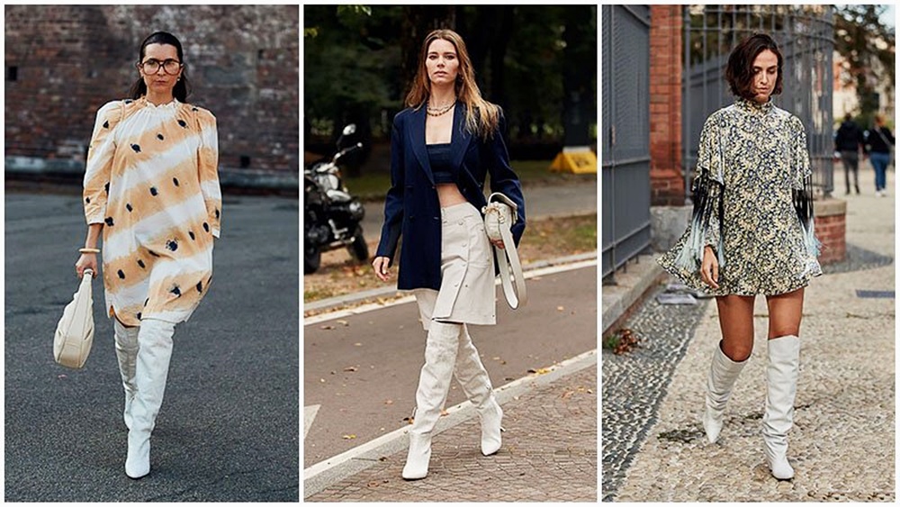 60년대 고고 댄서에 영감을 받아 만들어진 무릎 높이의 화이트 부츠 또한 자주 보이는 스타일링 중의 하나입니다. 패턴이 있는 미니 원피스나 스커트, 혹은 펑키한 디자인의 레깅스와 함께 착용하면 더욱 돋보이는 스타일링이 가능하죠.