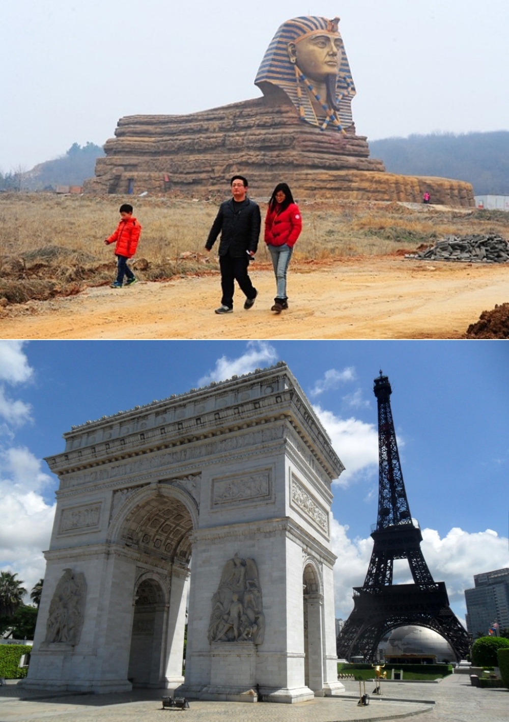 중국에는 에펠탑뿐만이 아니라 세계 각국의 유명한 가짜 관광지를 만들어두었습니다. 모스크바, 워싱턴 DC, 시드니, 이집트에서 베낀 건축물뿐만이 아니라 도시 하나를 통째로 빌려온 것 같은 수준의 '복제 도시'도 존재하죠. 중국에서는 해외의 관광지만을 베끼는 것은 아닙니다. 자국의 문화재도 마구잡이로 건설하고 있습니다. 만리장성, 병마용, 자금성 등의 유명 유적지를 조잡하게 복제한 시설을 중국 중소도시에서 흔히 볼 수 있으며 톈안먼(천안문)의 경우 전국 각지에 10개 이상의 짝퉁이 건설되어 있다고 하네요.