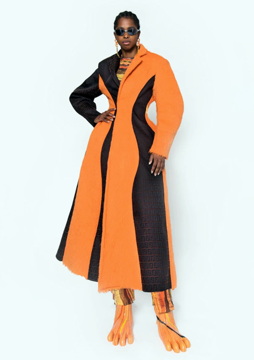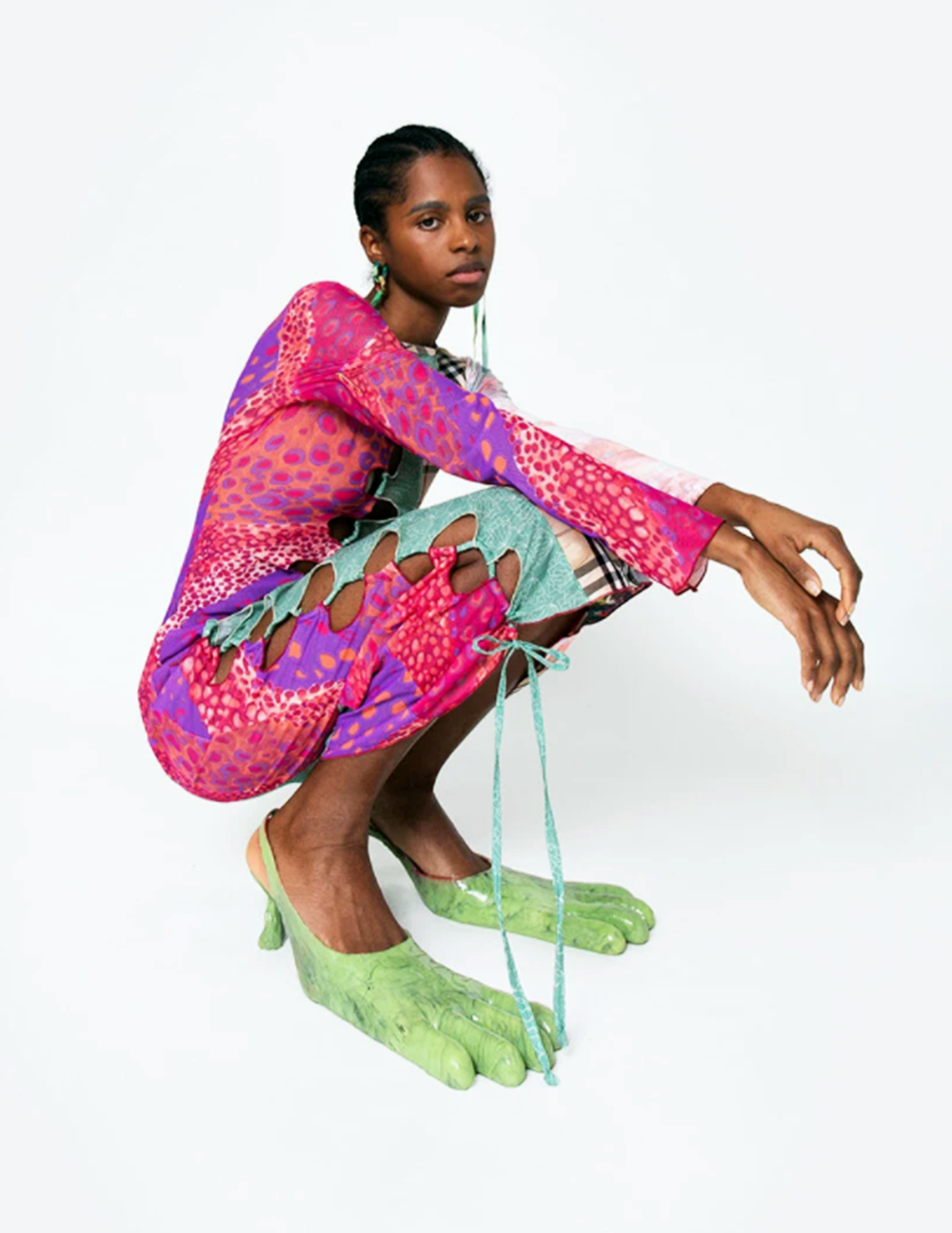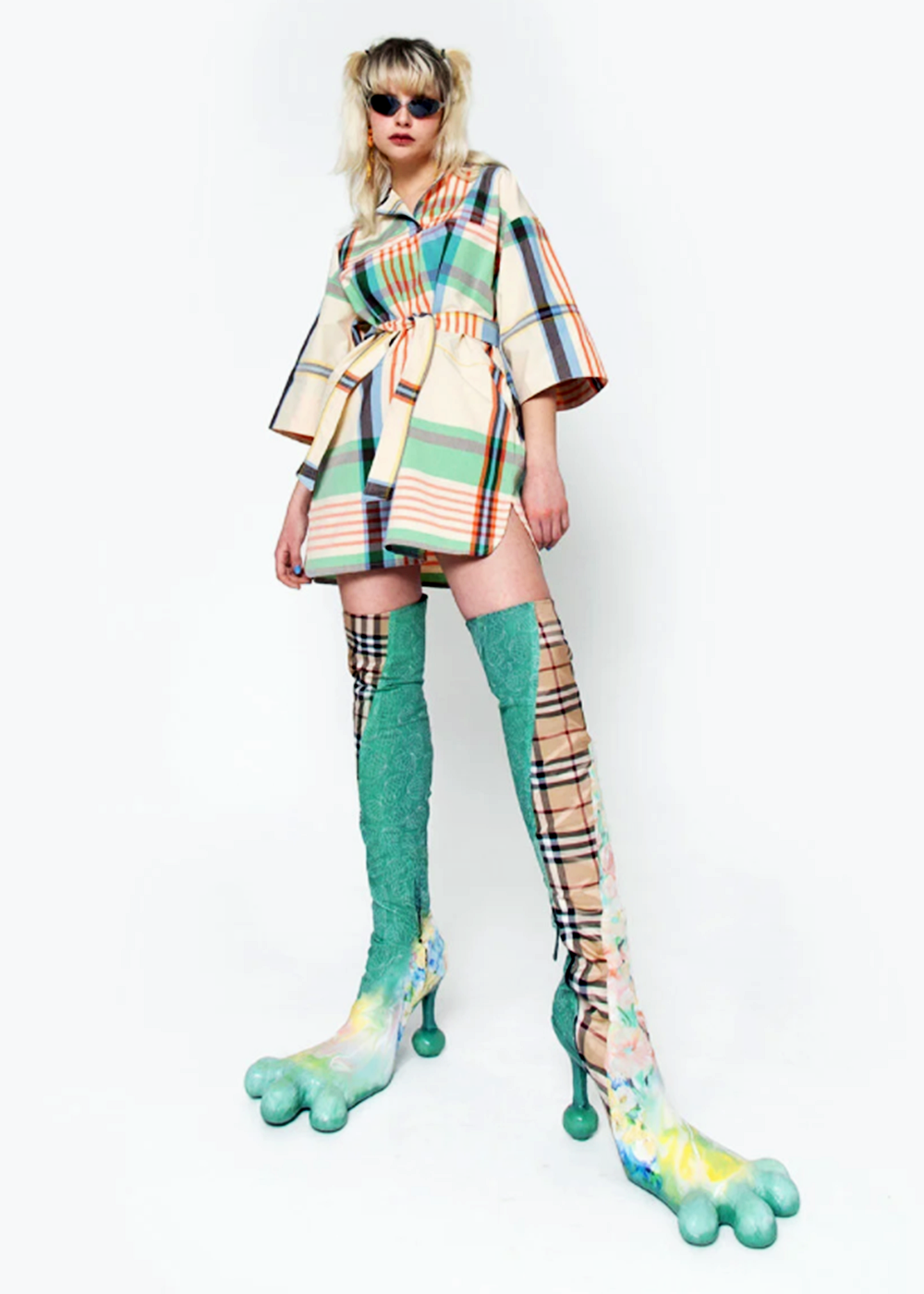 2개월 후 그는 다시 한번 독특한 컬렉션을 선보였습니다. 이 컬렉션에는 컷아웃 드레스와 네 발가락 부츠가 포함되어 있었는데요. 매우 익숙한 패턴이 보이는 것이 특징입니다. 바로 잘 알려진 명품 브랜드 버버리와 펜디의 상징적인 로고가 제품에 들어가 있는 것이었습니다.