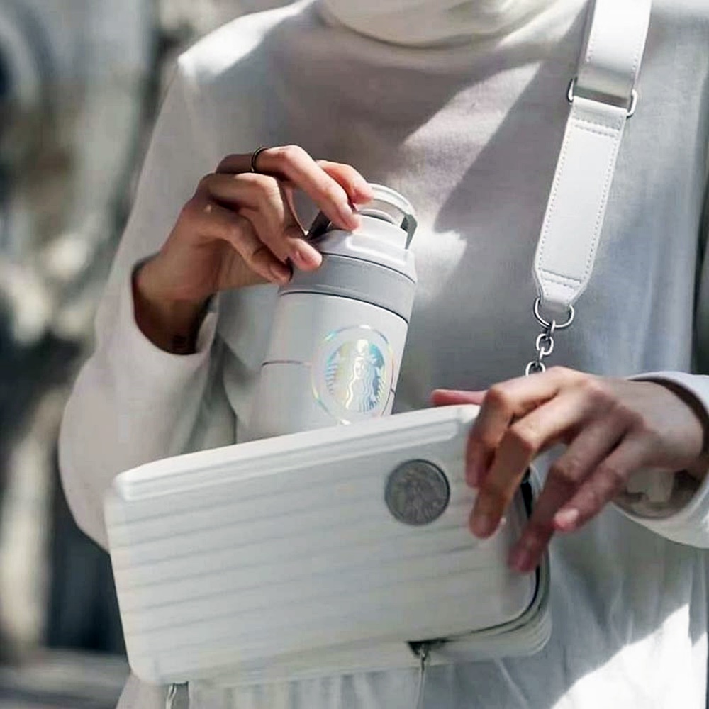 이뿐만이 아닙니다. 여행 캐리어에 영감을 받아 만들어진 가방도 있는데요. 마치 필통처럼 생긴 이 가방은 작은 물통이 들어갈만한 사이즈입니다. 이 가방을 보자마자 해외여행이 그리워지는 것은 기분 탓일까요? 보특백도 있습니다. 만약 물통을 들고 다니기 귀찮다면 이 반짝이는 보틀 백에 주목하는 것도 좋겠네요. 여기에도 베어리스타는 윙크를 하고 있습니다.