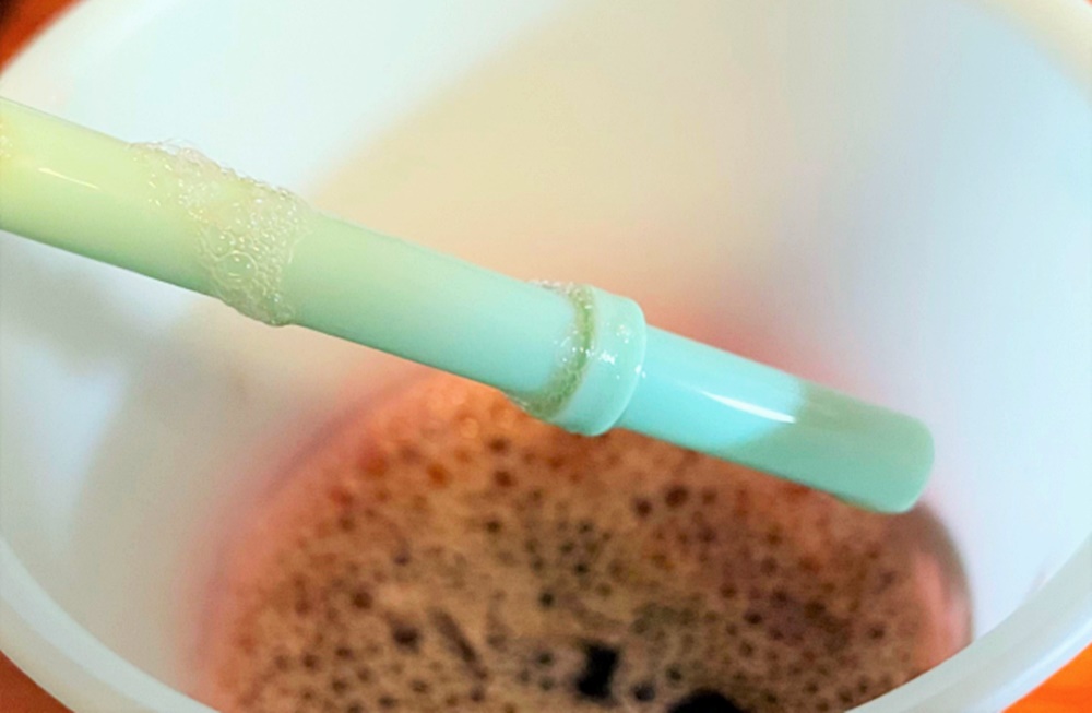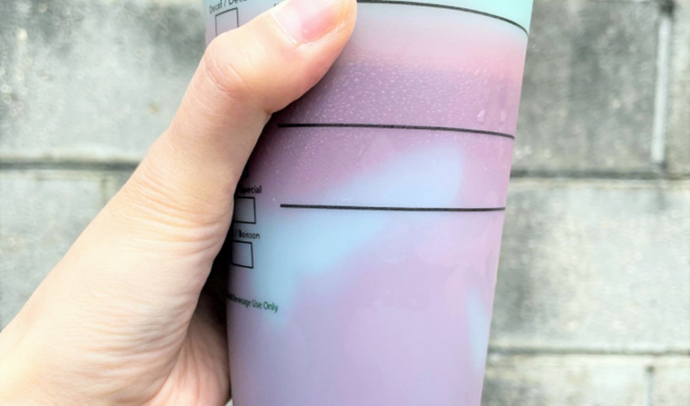 음료가 담긴 곳은 핑크로, 그리고 실온 상태로 있는 부분은 민트 컬러로 되어 있는 것이죠. 음료가 담겨있는 부분과 담겨있지 않은 부분 사이의 그러데이션도 아름답습니다. 마치 이는 하늘의 노을을 연상케 하죠. 손으로 컵을 잡으면 손의 온도로 인해 컵이 다시 민트색으로 변하는 것도 볼 수 있네요.