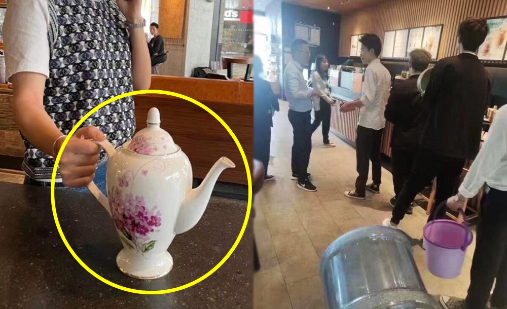 '컵'에 대한 해석은 사람들마다 각자 다른 것 같은데요. 일반적으로 우리가 생각하는 '컵'이나 '텀블러'를 가지고 온 사람들도 있었지만 초대형 컵, 티포트, 양동이, 심지어 정수기 물통을 들고온 사람들도 있었습니다. 그리고 이런 광경은 중국 SNS에 올라오며 많은 중국인들의 창의성(?)을 엿볼 수 있는 계기가 되었네요.