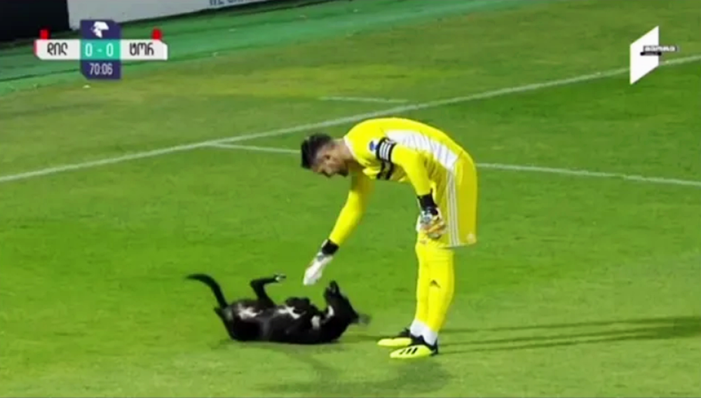 그러나 TPO를 깡그리 무시하고 의외의 장소에서 배를 긁어달라고 벌러덩 드러누운 한 강아지가 화제가 되고 있습니다. 바로 조지아의 프로 축구 경기 중에 일어난 일입니다. 축구 경기가 한창 진행되고 있는 후반 68분 양 팀은 0대 0으로 팽팽한 경기를 이어가고 있습니다. 그리고 골키퍼가 골킥을 하기 위해 준비하고 있는 동안 한 검은색 개가 축구장에 난입했습니다.