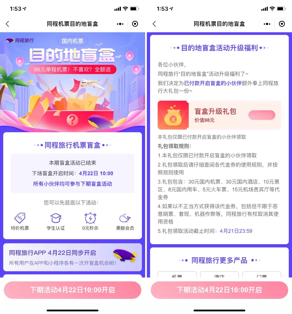 중국신문망 등 현지 언론에 따르면 씨트립, 퉁청, 플리기, 취날 등 중국의 온라인 여행사에서는 항공권 랜덤박스를 판매하고 있는데요. 항공권과 기차 티켓의 경우 출발지만 선택이 가능하고 목적자와 출발 날짜, 시간 등은 랜덤인 경우가 있습니다. 예를 들어 '퉁청뤼싱'에서는 랜덤박스를 98위안, 우리 돈으로 약 1만 7천 원에 판매하고 있는데요. 만약 출발 날짜와 시간, 그리고 목적지가 마음에 안 든다면 30분 이내에 위약금 없이 취소할 수 있습니다. 퉁청에서도 98위안, 씨트립에서는 99위안, 플리기에서는 66위안 항공권 상품을 선보였네요. 플리기의 관계자는 공항세 50위안을 제외하면 티켓 가격은 16위안으로 밀크티 한 잔 가격과 같다고 밝히고 있습니다.