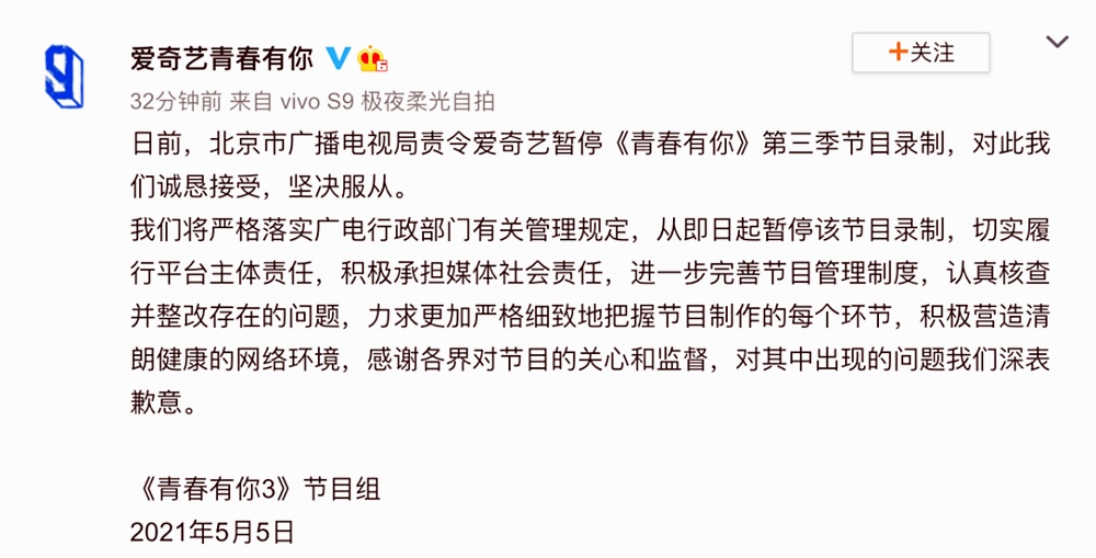 당국에서도 나섰습니다. 방송 통신 심의를 담당하는 베이징 광전국에서는 이 프로그램에 대한 녹화 제작을 잠정 중단했습니다. 프로그램을 제작하는 아이치이 측에서도 공식 SNS를 통해 '성실히 조사에 임하고, 사회적인 책임을 지겠다'면서 사과문을 발표하기도 했습니다.