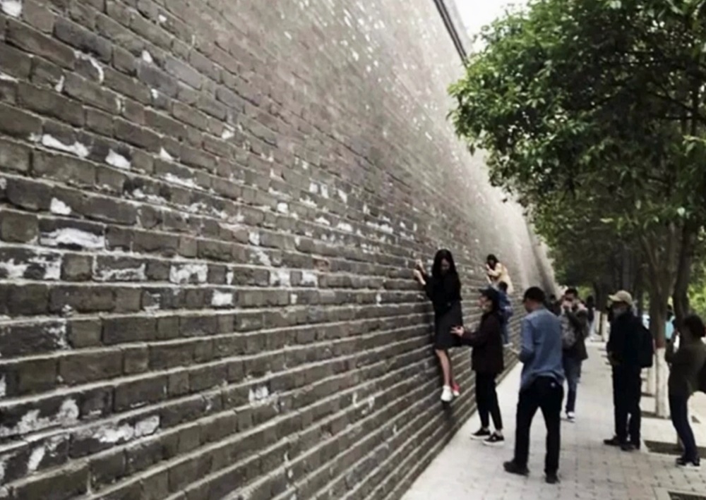 먼저 '병마용'으로 유명한 시안에서 있었던 일입니다. 시안에서는 몇몇 관광객들이 고대에 만들어진 도시의 성벽을 타고 올라가다 적발되었습니다. 이 성벽은 600년 전에 만들어진 것이라고 하는데요. 이에 성벽을 구성하고 있는 벽돌이 심각하게 손상되었다고 하네요. 이 장면은 영상으로 촬영되었습니다. 영상 속에서는 성인들이 사진을 찍기 위해 벽을 올라가고 있으며, 또 어떤 성인들은 아이들이 성벽에 올라갈 수 있도록 밀어주고 있습니다.
