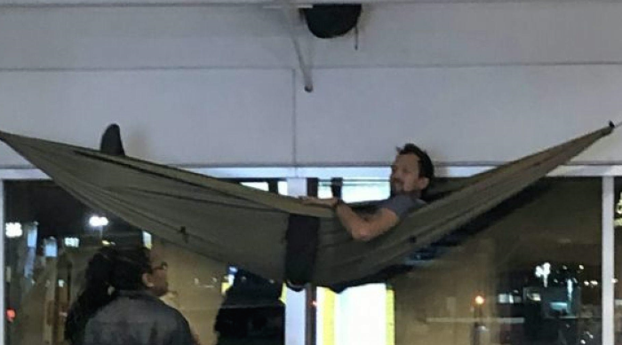 신원이 밝혀지지 않은 이 남자는 해먹에서 잠이 들었습니다. 한 목격자에 의하면 그가 한창 수면을 취하고 있는 도중 한 공항 직원이 다가왔으며 이후 그 남자는 해먹에서 내려왔다고 합니다. 이 목격자는 SWNS와의 인터뷰에서 '공항 직원이 해먹을 두드렸고 해먹 안 남자의 머리는 장시간 수면을 취한 듯 삐죽삐죽' 했다고 말했습니다. 또한 '그 남자는 매우 순종적이었고 내려오기 위해서 의자를 사용했다'라고 말하기도 했습니다.