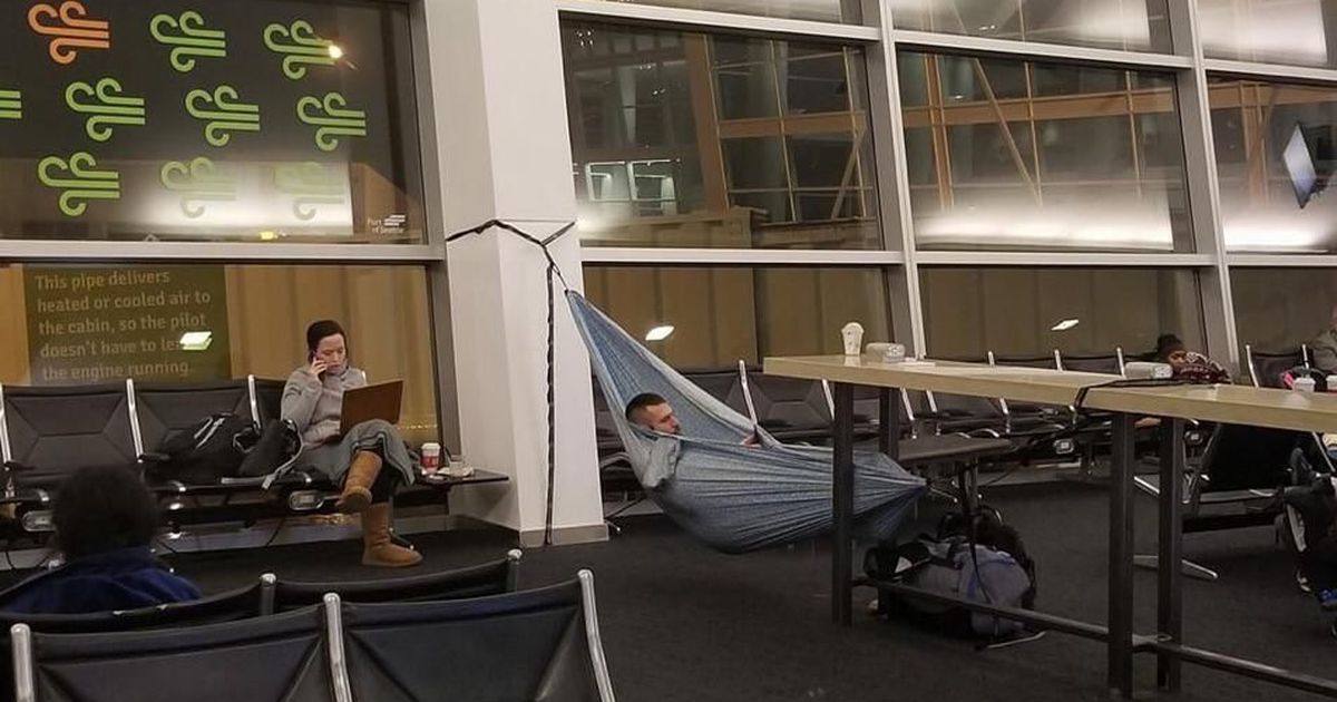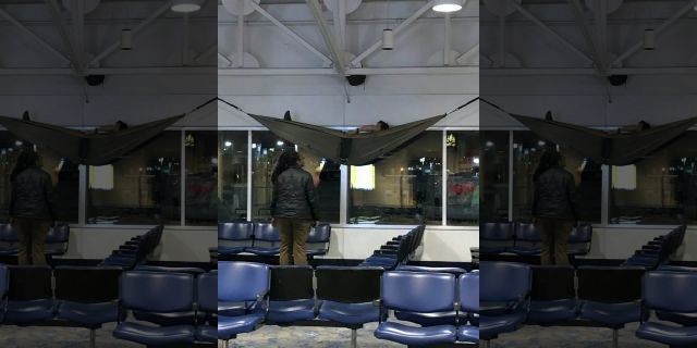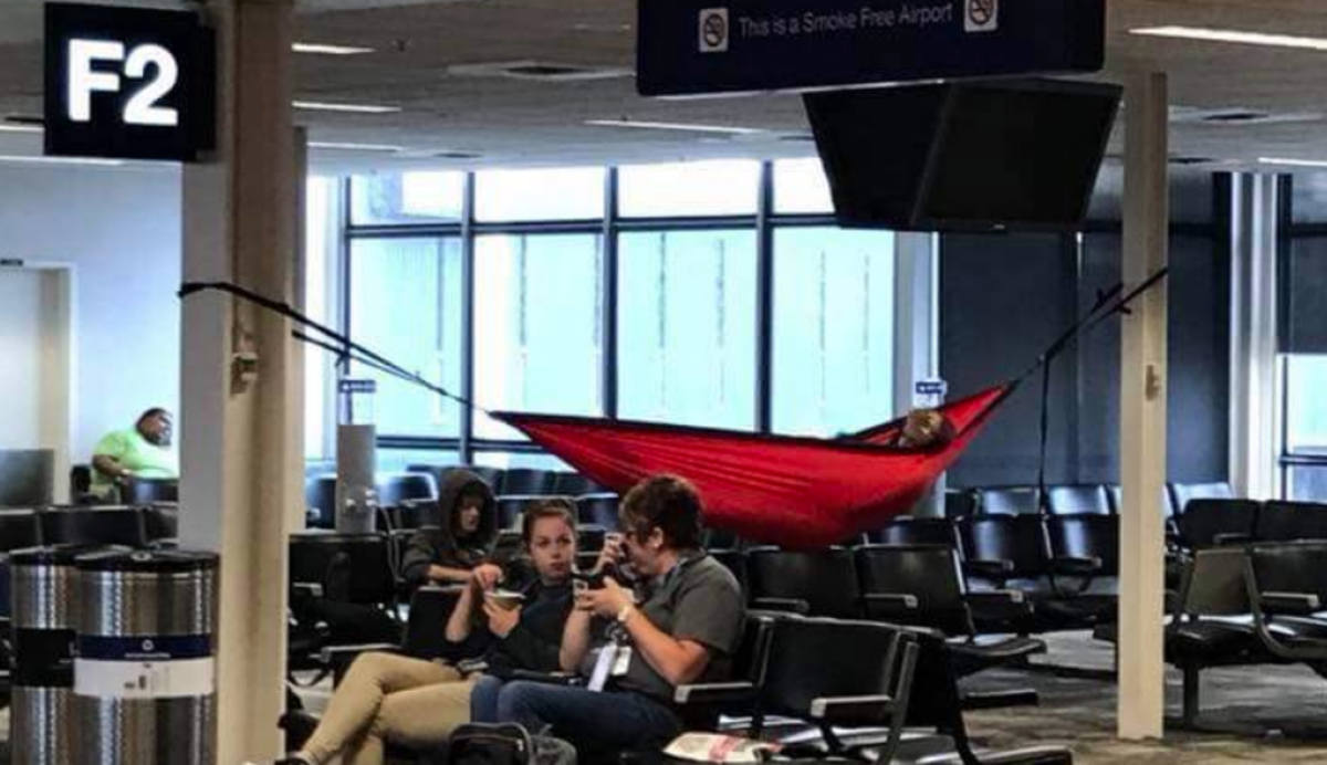 이 모든 걱정을 비웃기라도 하듯 해외의 한 커뮤니티에는 기발한 사진이 하나 올라왔습니다. 바로 공항의 기둥에 해먹을 설치하고 휴식을 취하고 있는 여행자의 사진이었는데요. 이 사진은 미국의 '샬럿 더글라스 국제공항' 터미널에서 찍힌 것으로 알려져 있습니다.