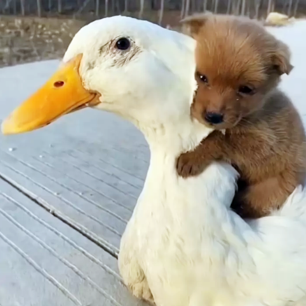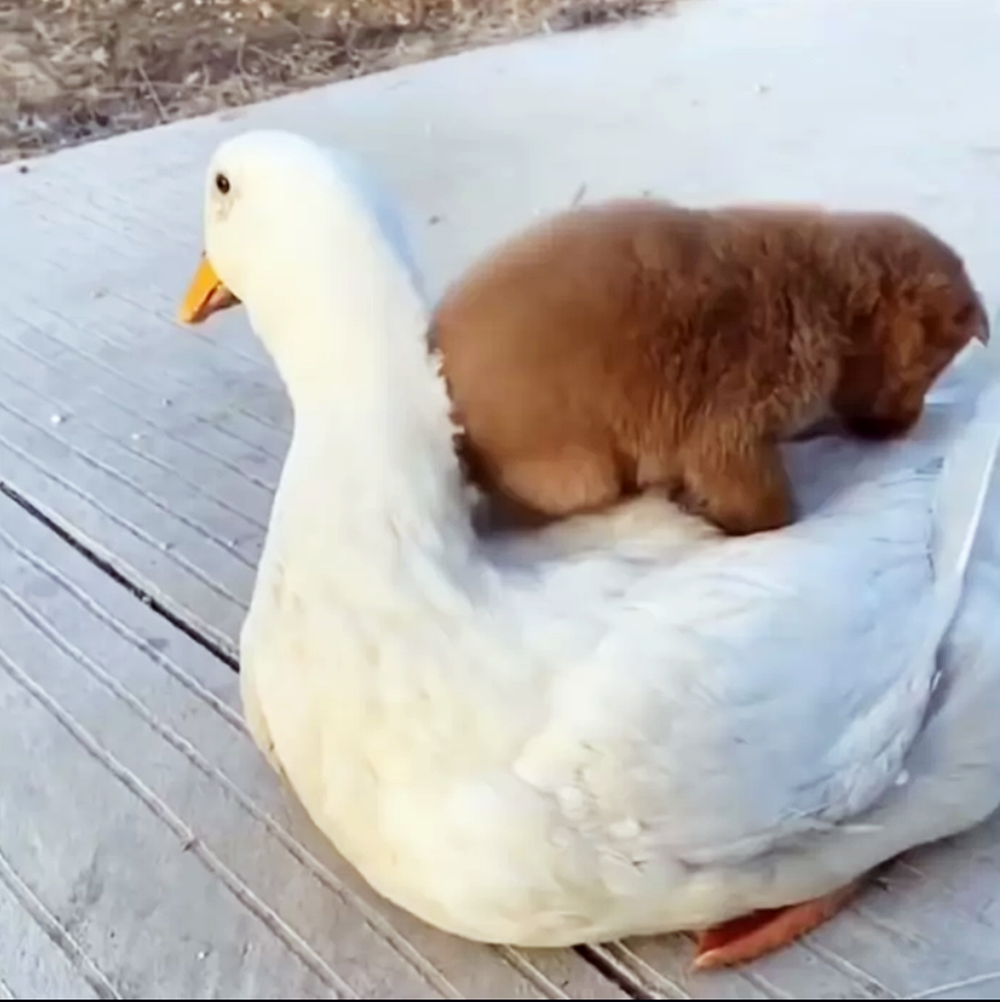 사실 오리는 그리 접근하기 쉬운 동물은 아닙니다. 다른 동물들이 접근하면 날개를 퍼덕이고 쪼아대기 때문이죠. 그러나 어떤 이유에서인지 이 오리는 강아지에게 상당한 호의를 베풀고 있는데요. 자신의 앞에 등장한 강아지가 자신의 등을 타오르고, 자리를 잡고 목을 움켜잡아도 오리는 자신의 포근한 등을 강아지에게 내주고 있습니다. 강아지는 마치 엄마의 등에 업힌 듯 오리의 목을 꼭 잡고 이곳에 얼굴을 파묻고 있네요.