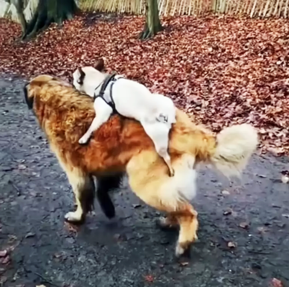 한편 강아지가 다른 동물의 등에 타오르는 것은 그리 보기 쉬운 광경은 아닌데요. 그럼에도 한 프렌치 불독은 자신보다 덩치가 큰 레온베르거에게 올라타려고 시도하고 있는 영상 또한 화제가 되고 있습니다. 영상 속 레온베르거는 프렌치불독이 자신의 등에 계속해서 올라타도 별로 개의치 않는 모습을 보이고 있네요.