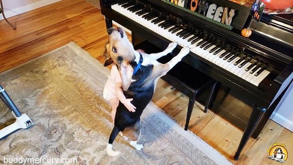 피아노를 치는 이 비글의 이름은 '버디 머큐리(Buddy Mercury)'입니다. 버디 머큐리는 이 집의 아기와 항상 사이좋게 지내고 있는데요. 버디 머큐리와 인간 주인이 가장 좋아하는 것은 바로 함께 노래하고 춤추는 것입니다. 아기가 춤을 추고 노래를 부르면 버디 머큐리는 아이의 노래에 맞춰 피아노를 치며 하울링을 하고 있습니다.