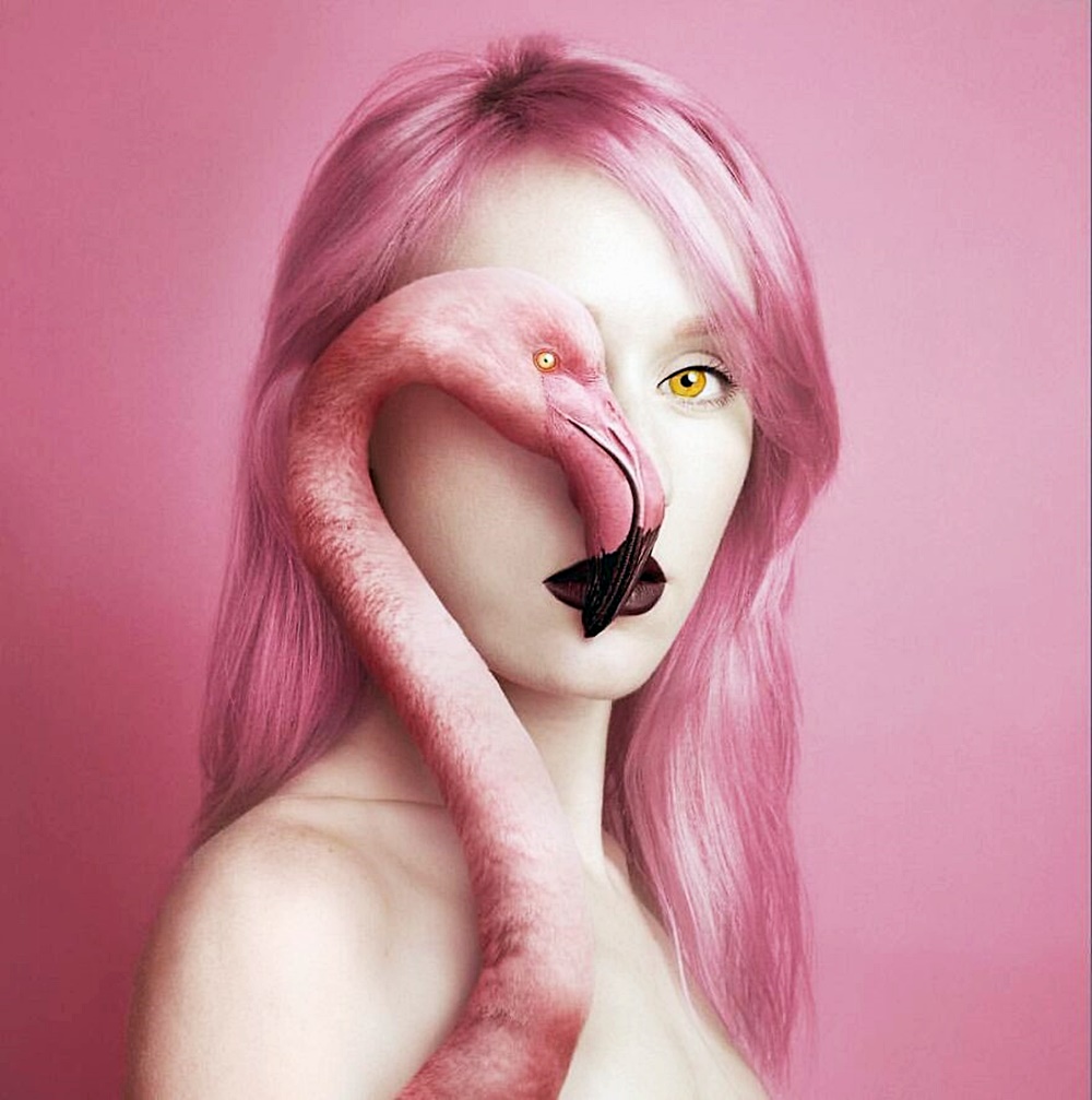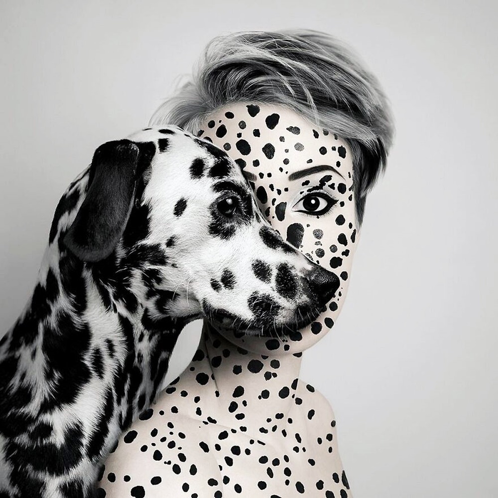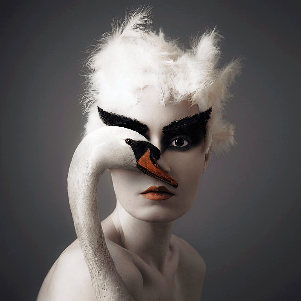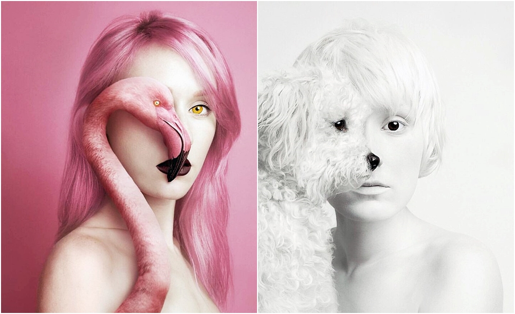 사실 보르시가 사진을 찍기 위해 동물과 함께 스튜디오에서 작업하는 것은 아닙니다. 동물의 이미지와 자신의 자화상은 절묘하게 포토샵되어 만들어진 것인데요. 보르시는 자신의 사진이 편집되지 않은 실제처럼 보이는데 초점을 맞추고 있습니다.