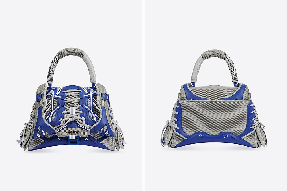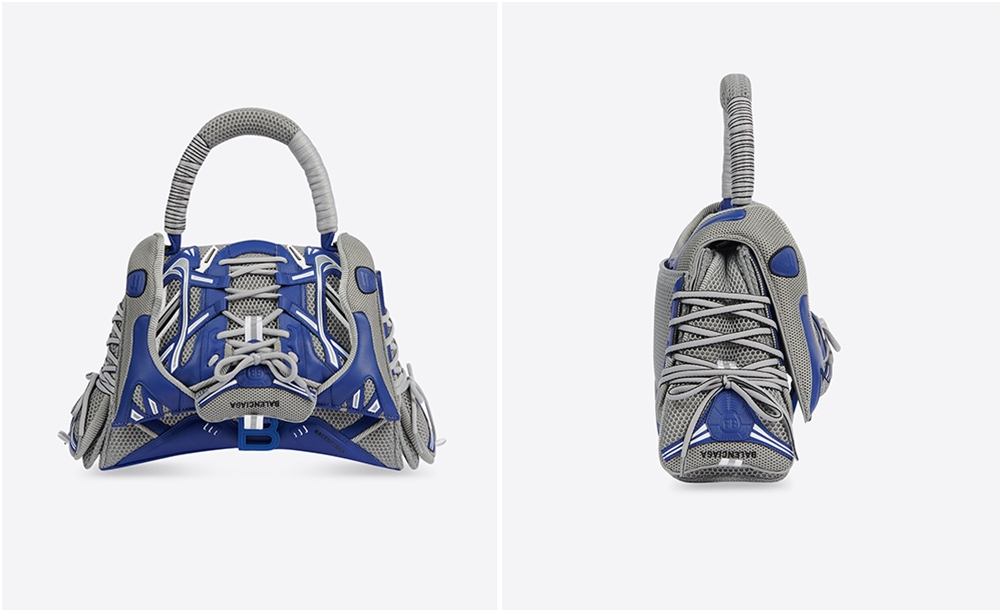 스니커헤드 가방은 총 두 가지로 출시되었습니다. 먼저 스몰탑핸들백입니다. 이 가방은 회색과 파란색으로 이루어져 있으며 발렌시아가의 스니커즈처럼 생겼죠. 이 가방의 외관은 운동화 같이 생겼지만 내부는 인조 가죽으로 되어 있는데요. 이에 매끈한 느낌을 받을 수 있습니다.