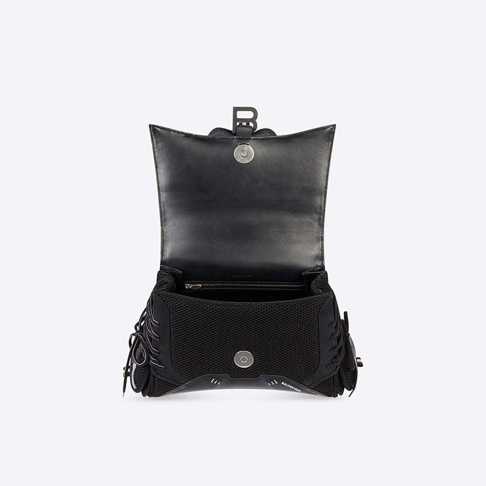 스니커헤드 가방의 특징은 바로 운동화를의 디자인을 그대로 차용한 외관입니다. 가방은 패브릭과 인조 가죽, 메시 등 운동화에 사용하는 소재를 혼합해 만들어졌으며 오버레이와 슈레이스 등 실제 스니커즈를 방불케하는 다양한 디테일이 더해졌습니다. 가방의 모양은 발렌시아가의 시그니쳐 가방은 아워글래스의 모양을 본땄는데요. 아래 부분은 아치형으로 되어 있는 것을 볼 수 있습니다. 발렌시아가의 아이코닉한 B로고 또한 스터드 자석 클로저에 부착되어 있네요.
