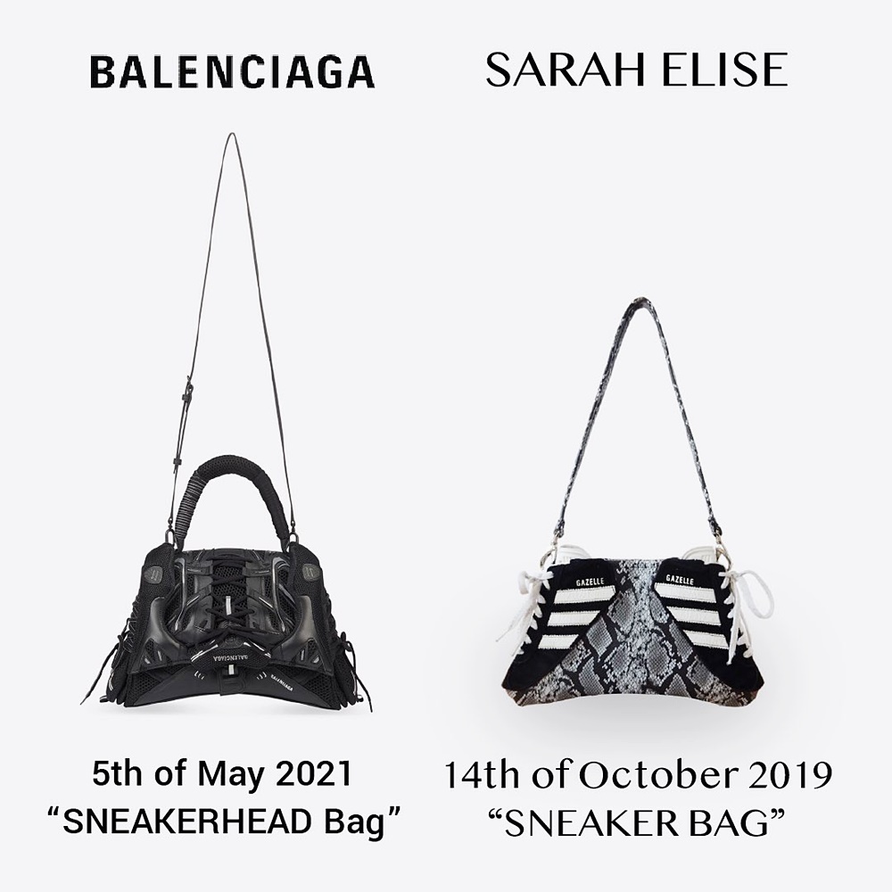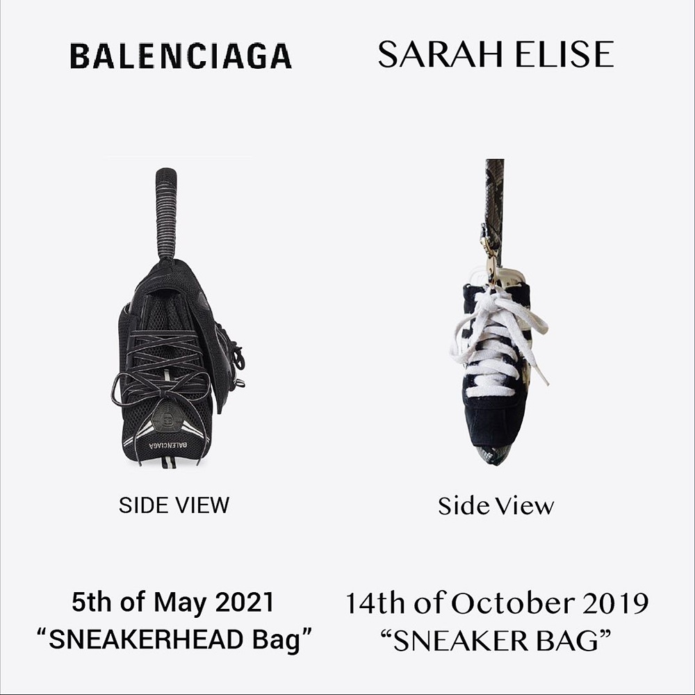 한편 이 제품은 표절 논란에 시달리고 있기도 한데요. 네덜란드 출신의 디자이너 사라 엘리제가 자신이 2019년 10월에 공개한 '스니커백'과 발렌시아가의 '스니커헤드백'의 콘셉트가 유사하다고 주장한 것이었습니다. 사라 엘리제는 곡선이 포함되어 있는 삼각형 모양의 가방 모양, 운동화의 어퍼 부분을 클로저로 사용한 것, 사이드 부분을 운동화 모양으로 만든 것 등을 그 이유로 꼽았습니다.