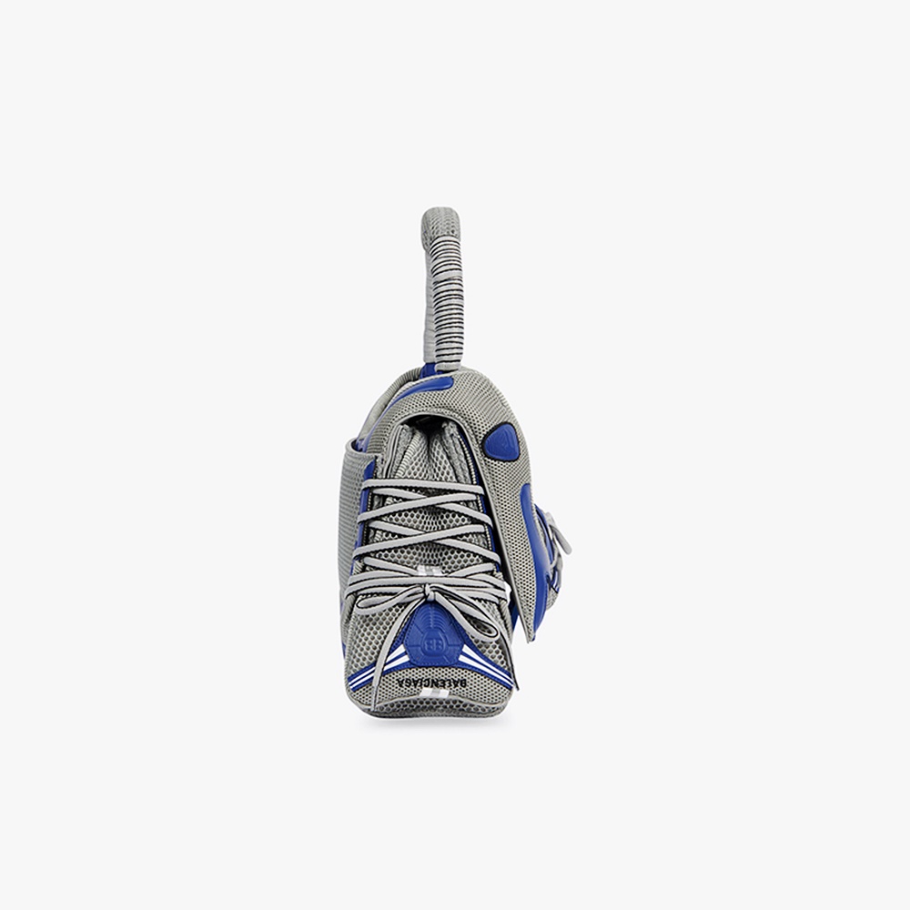 스니커헤드 가방은 총 두 가지로 출시되었습니다. 먼저 스몰탑핸들백입니다. 이 가방은 회색과 파란색으로 이루어져 있으며 발렌시아가의 스니커즈처럼 생겼죠. 이 가방의 외관은 운동화 같이 생겼지만 내부는 인조 가죽으로 되어 있는데요. 이에 매끈한 느낌을 받을 수 있습니다.