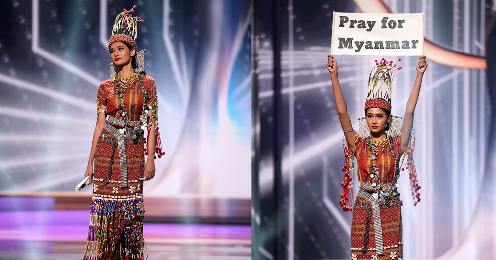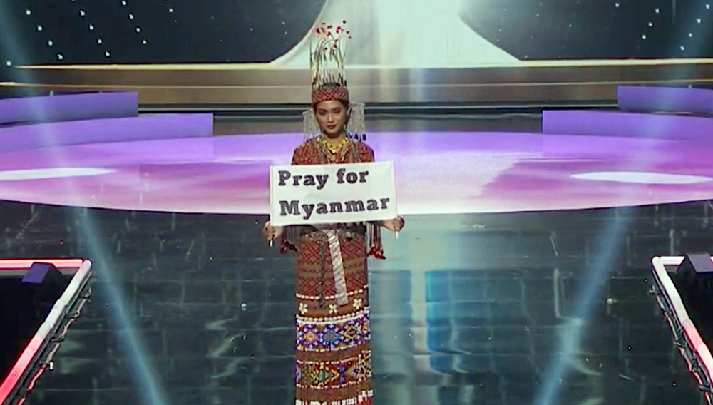 현재 쿠데타가 일어나고 있는 미얀마. 그리고 미얀마의 대표로 출전한 미스 미얀마 투자 윈 릿은 전통 의상 경연대회에서 미얀마 쿠데타에 대한 국제 사회의 관심을 촉구했습니다. 투자 윈 릿은 다른 나라의 참가자들처럼 전통 의상을 입고 무대를 성큼성큼 걸어왔는데요. 미소를 띤 채 한껏 환하게 웃는 다른 참가자들과는 다소 달랐습니다. 바로 비장함을 띈 얼굴이었기 때문입니다. 워킹을 마친 투자 윈 릿은 손에 들고 있던 종이를 펼쳐 보였습니다. 그리고 이곳에는 '미얀마를 위해 기도를'이라는 문구가 적혀있었죠. 투자 윈 릿은 팻말을 접은 뒤 미얀마 전통 방식으로 합장을 했는데요. 이에 관객들은 환호와 박수로 응원했습니다. 그리고 이 의상은 전통의상 경연대회 1등에 올랐습니다.