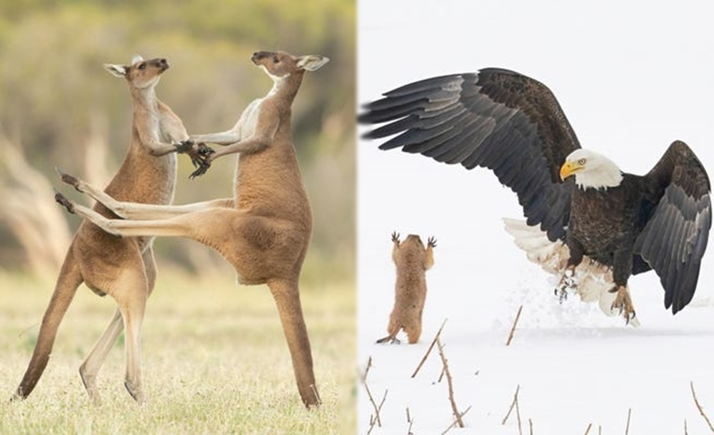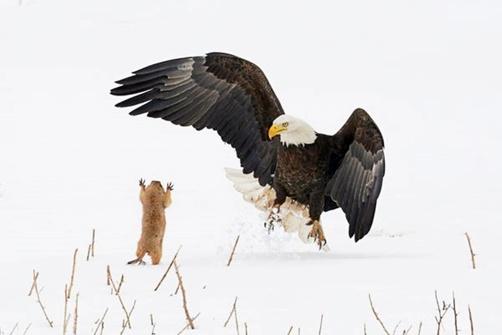 대머리 독수리와 프레리독의 모습을 담은 사진입니다. 이 사진은 미국 콜로라도에서 사진작가 아서 트레비노(Arthur Trevino)가 찍은 것인데요. 대머리 독수리가 프레리독을 잡으려 했지만 1차 시도에서 실패하고, 구사일생한 프레리독은 대머리 독수리에게 뛰어올라 대머리 독수리를 놀라게 했다고 합니다. 그리고 근처 굴로 피신하며 프레리독의 전략은 성공했죠. 동물판 다윗과 골리앗이 아닐까 싶네요.