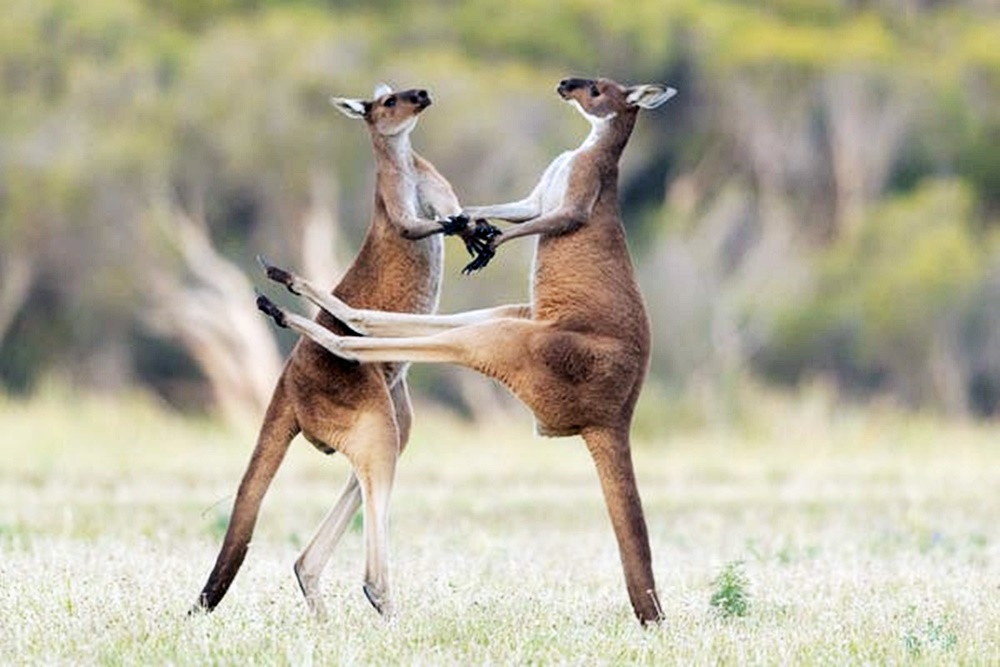 두 마리의 캥거루가 싸우고 있는 모습입니다. 사진의 오른쪽에 있는 캥거루가 상대 캥거루의 배에 발차기를 날리려 했지만 그만 조준에 실패하고 말았네요. 이 사진은 리아 스캐단(Lea Scaddan)이 찍은 것입니다.