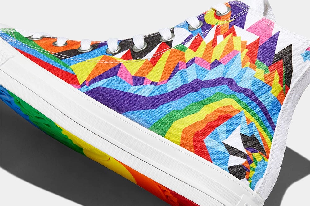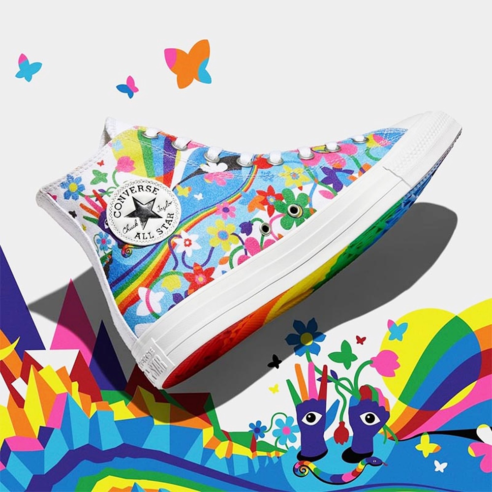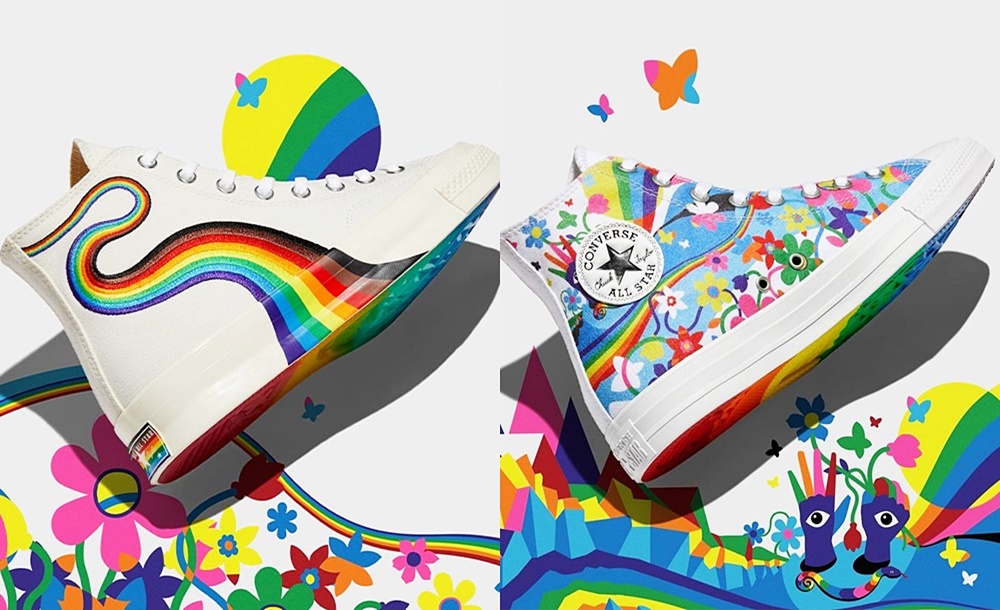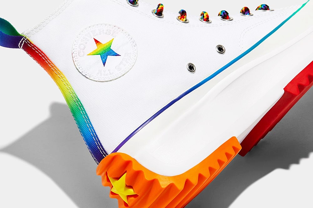 올스타슬라이드에는 무지개 색상의 얼음산 디자인이 들어가 있네요. 청키한 디자인을 좋아하는 사람들을 위해 런스타하이크도 프라이드 컬렉션으로 준비되어 있습니다. 현재 2021년 프라이드 컬렉션은 컨버스 홈페이지에서 구매할 수 있으며 이 컬렉션에서 나온 수익금은 성소수자 지원 단체에 기부된다고 하네요.