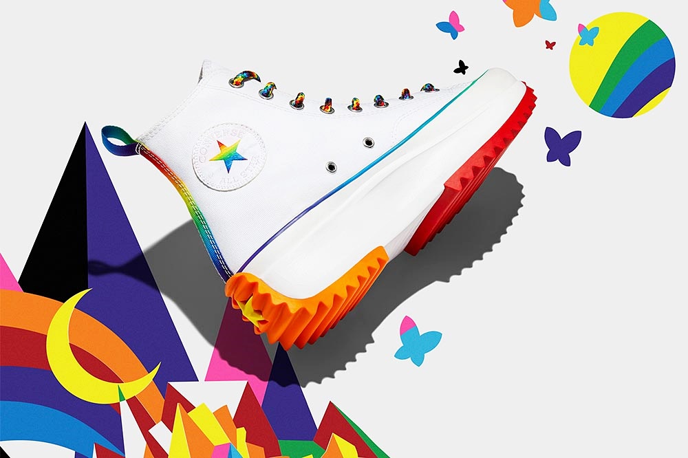 올스타슬라이드에는 무지개 색상의 얼음산 디자인이 들어가 있네요. 청키한 디자인을 좋아하는 사람들을 위해 런스타하이크도 프라이드 컬렉션으로 준비되어 있습니다. 현재 2021년 프라이드 컬렉션은 컨버스 홈페이지에서 구매할 수 있으며 이 컬렉션에서 나온 수익금은 성소수자 지원 단체에 기부된다고 하네요.
