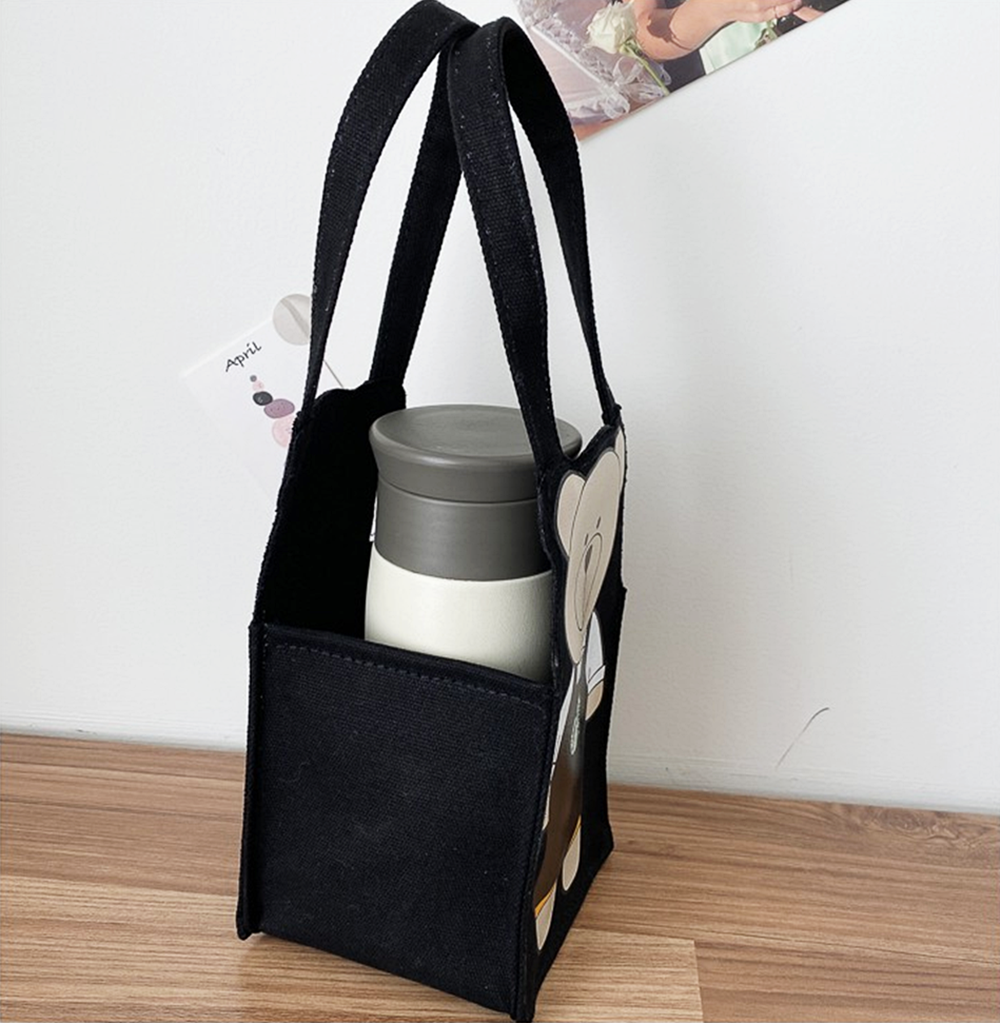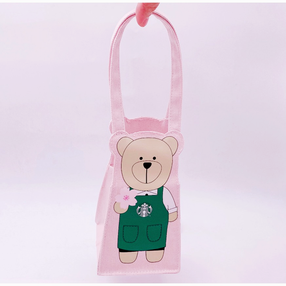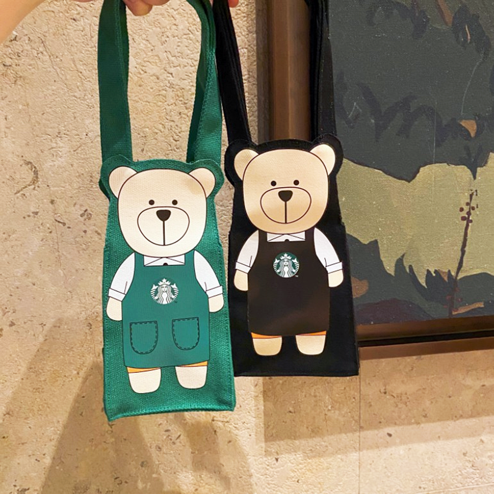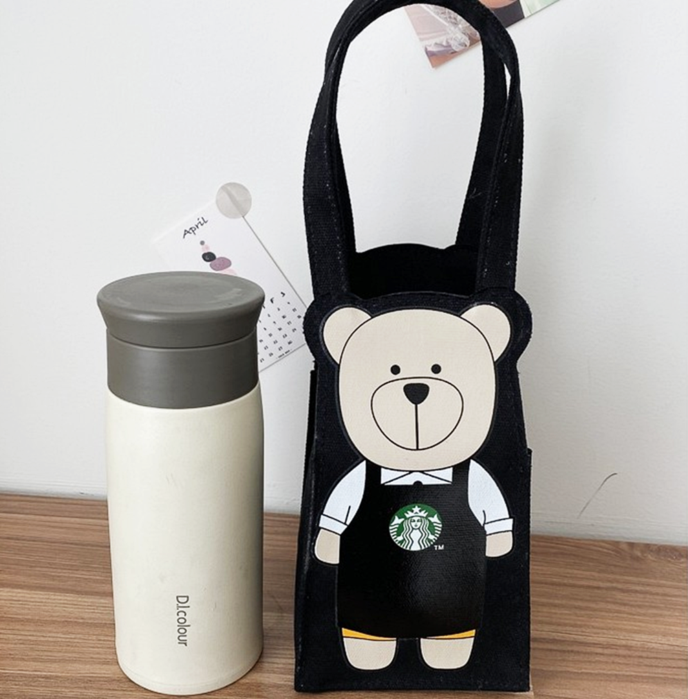 이 가방은 꽤 작아보이는데요. 그럼에도 큰 텀블러, 물병, 그리고 벤티 사이즈의 음료수도 들어갑니다. 또한 이 가방은 스타벅스의 클래식 컬러인 녹색을 비롯해 검정, 핑크, 레드 등 총 네 가지의 색상으로 구성되어 있습니다. 가방에는 스타벅스의 캐릭터 중의 하나인 '베어리스타'가 프린트 되어 있어 귀여움을 더하고 있네요.
