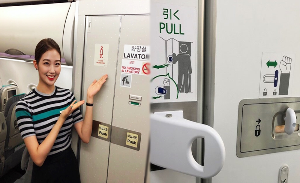 이뿐만이 아닙니다. 화장실 안쪽에 있는 잠금장치 또한 소형에서 대형으로 변경했는데요. 이에 손을 대지 않고 화장실 문을 잠글 수 있으며 화장실 내부의 불도 켤 수 있습니다. 단 이런 변화는 많은 사람들이 손을 대지 않고 사용해야 더욱 의미 있기에 이 손잡이와 도어락을 사용하는 방법을 기재한 스티커를 부착해 누구나 손을 대지 않고 기내 화장실을 사용할 수 있도록 했습니다.
