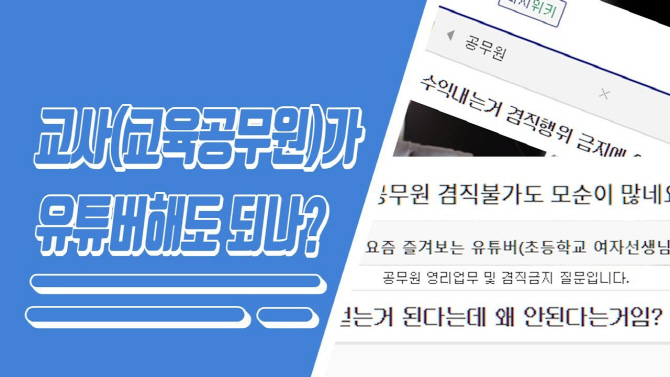 대부분 유튜버들은 '수익 창출'을 목표로 삼고 활동하고 있는데, 과연 교사 유튜버들은 합법적으로 수익 창출을 하는것이 가능할까요? 실제로 채널 '몽당분필'에서는 '교사(교육공무원)가 유튜버해도 될까요? 수익도 내도 될까요?_교사108번뇌_1번뇌'라는 제목으로 이에 대한 영상을 제작했습니다.