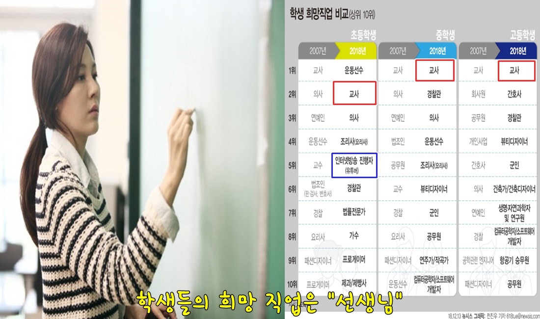 초등학생이 꿈꾸는 직업 2위, 중고등학생이 선호하는 직업 1위. 무엇인지 짐작할 수 있나요? 바로 교사입니다. 공무원이 가진 안정성, 방학 중 많은 휴식 시간 등의 현실적 이유 이외에도 학생들이 일상생활에서 가장 많이 접할 수 있는 직업이며 교과에 대한 흥미나 적성 등으로 인해 많은 학생들이 교사가 되기를 희망하고 있습니다. 교사는 최근 10년 이상 학생들의 장래 희망 상위권에 꾸준히 자리해왔습니다.