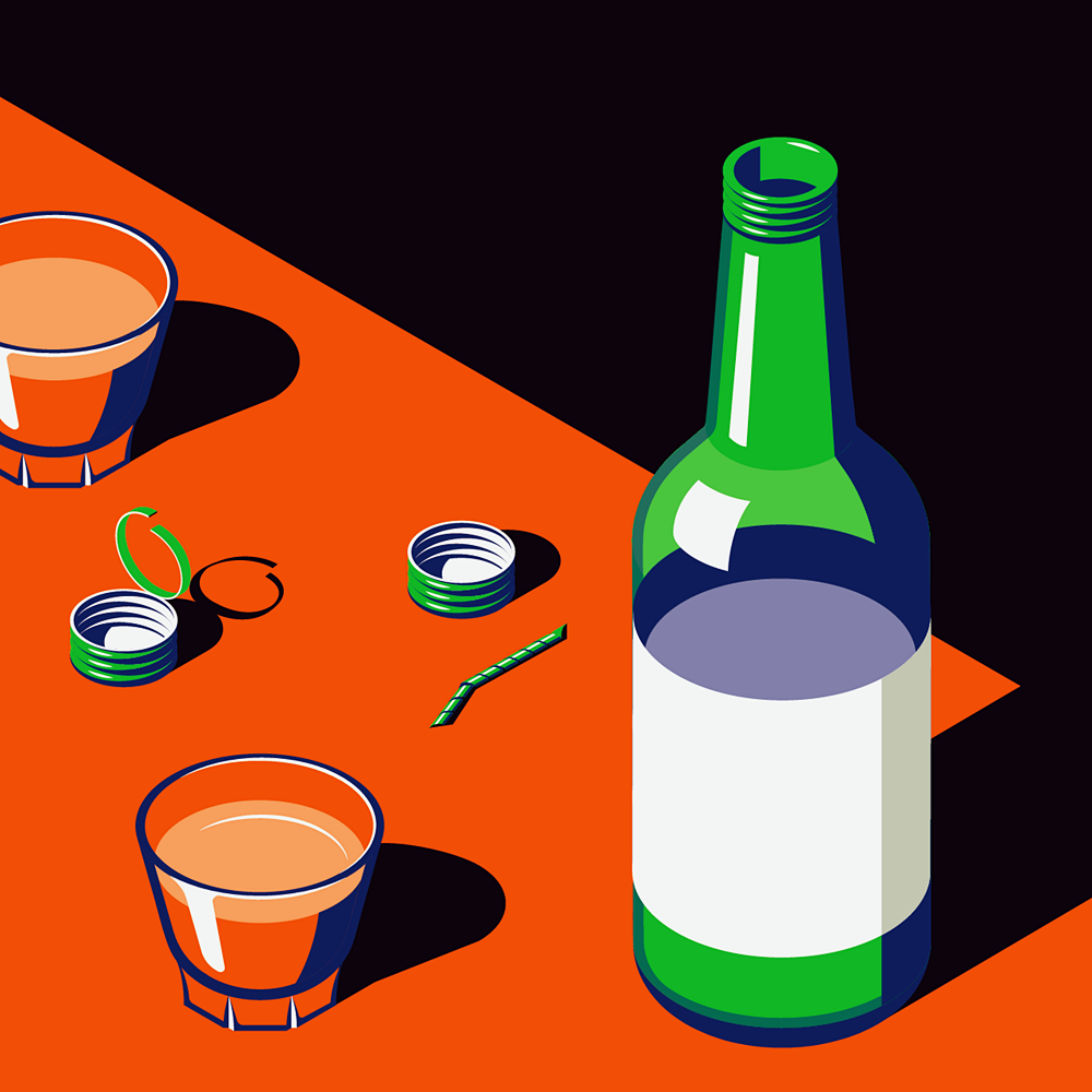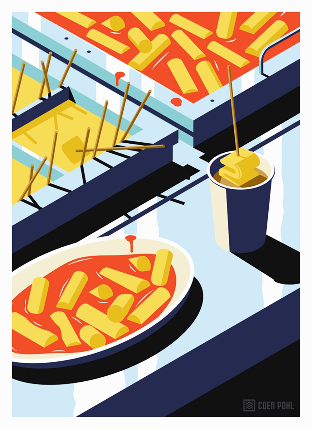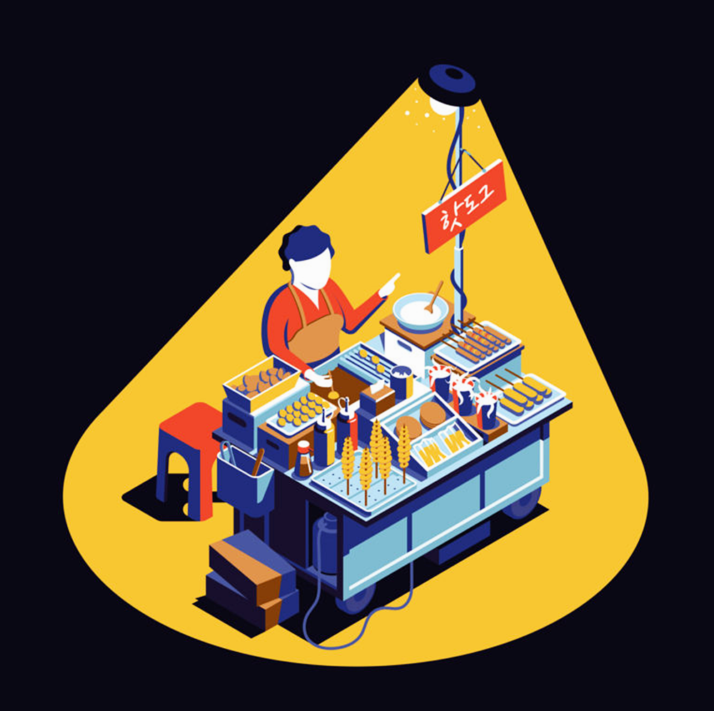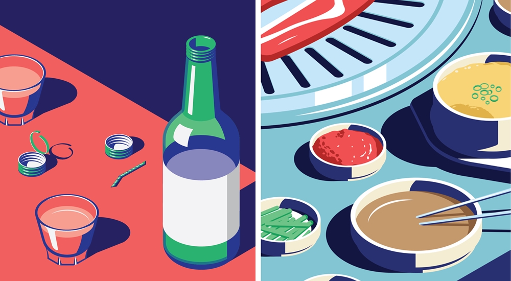 쿤 폴은 커다란 도시의 풍경 뿐만이 아니라 도시를 이루는 일상의 장면들을 아주 독특하고 비현실적인 색감으로 그려내고 있는데요. 길거리 떡볶이, 돌돌 말린 소주병 뚜껑, 김이 모락모락 나는 만두, 편의점 테이블 위에 흘린 컵라면 면발 등을 유쾌하고 실감 나게 표현하고 있습니다. 그는 서울 여행 후 그린 이 일러스트를 '서울에서의 밤(A Night in Seoul)'이라는 이름의 시리즈로 공개하고 있습니다.