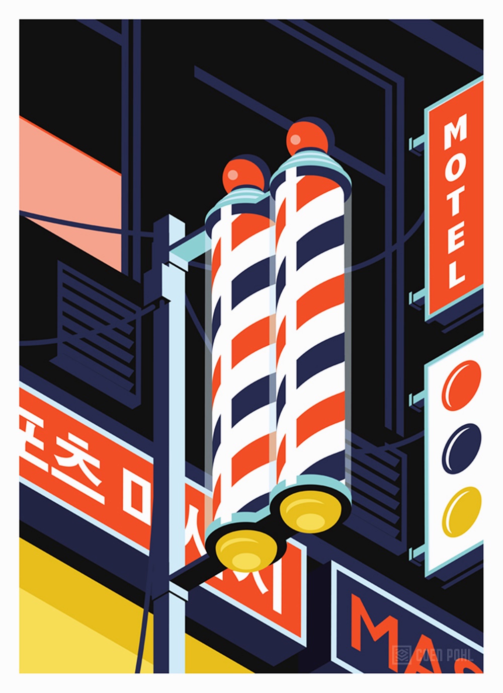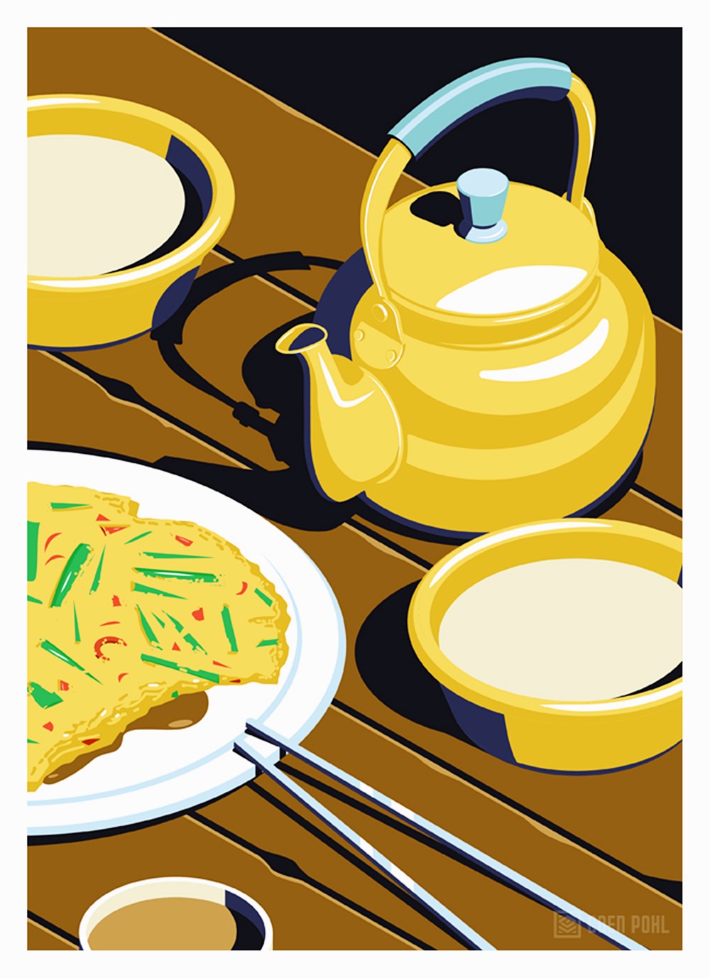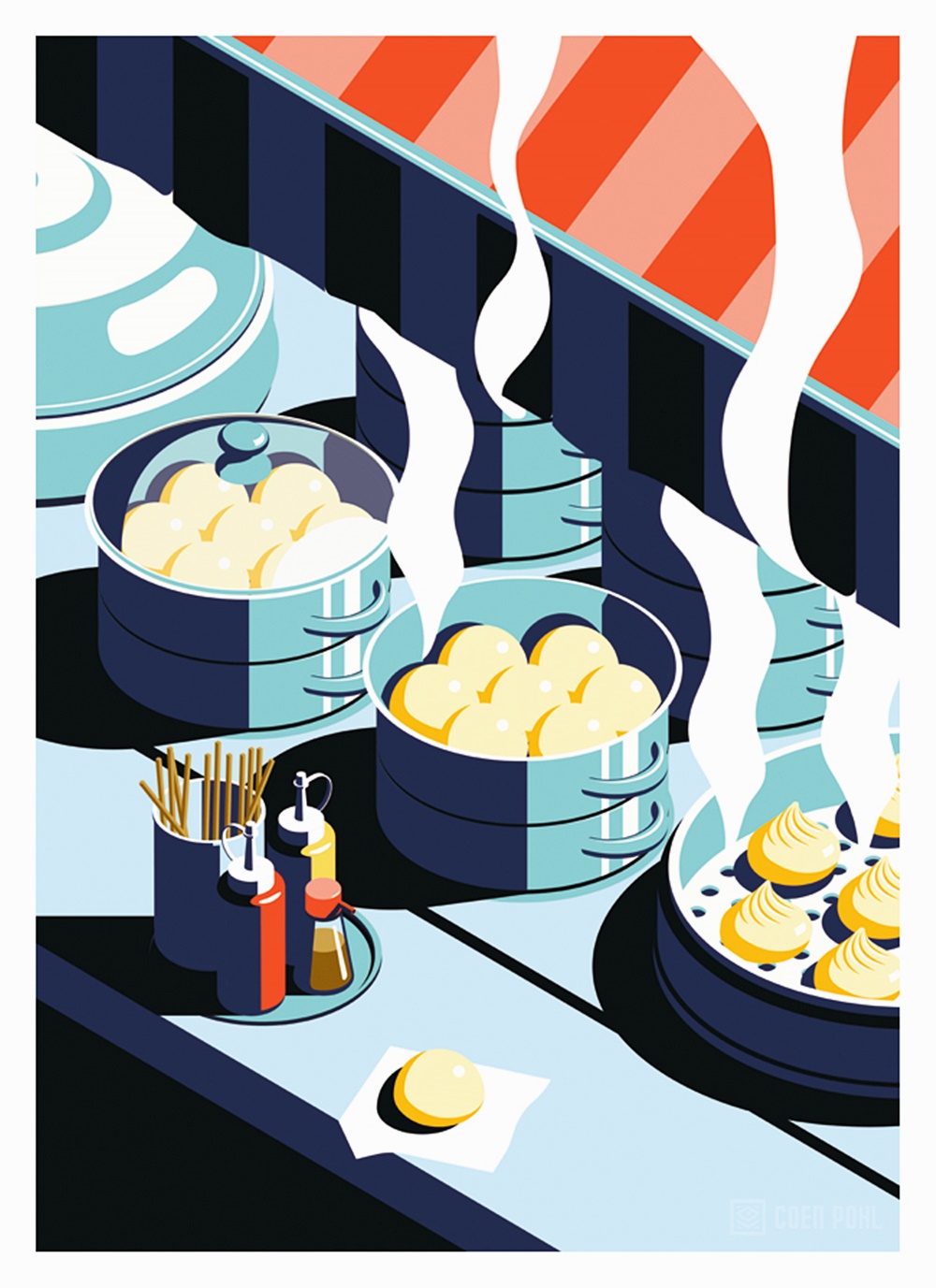 쿤 폴은 커다란 도시의 풍경 뿐만이 아니라 도시를 이루는 일상의 장면들을 아주 독특하고 비현실적인 색감으로 그려내고 있는데요. 길거리 떡볶이, 돌돌 말린 소주병 뚜껑, 김이 모락모락 나는 만두, 편의점 테이블 위에 흘린 컵라면 면발 등을 유쾌하고 실감 나게 표현하고 있습니다. 그는 서울 여행 후 그린 이 일러스트를 '서울에서의 밤(A Night in Seoul)'이라는 이름의 시리즈로 공개하고 있습니다.