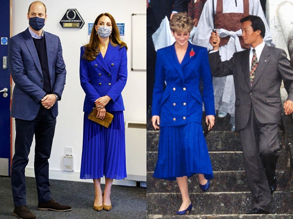 1992년 한국을 방문한 다이애나비의 모습입니다. 다이애나비는 파란색 플리츠 스커트에 더블 재킷을 입었습니다. 2021년 케이트 미들턴 또한 비슷한 패션을 선보였는데요. 재킷의 길이는 조금 더 짧아졌으며 브라운 컬러의 신발을 매치해 차별을 두었습니다.