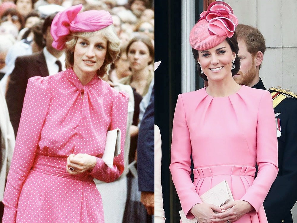 다이애나비는 1990년 웨스트민스터 사원을 방문하며 핫핑크 투피스를 입었습니다. 그리고 블랙 컬러의 펌프스와 클러치, 그리고 골드 주얼리를 매치했네요. 미들턴도 같은 색상의 원피스 재킷을 입었습니다. 그러나 비슷한 액세서리 매치로 다이애나비를 떠올리게 했습니다.