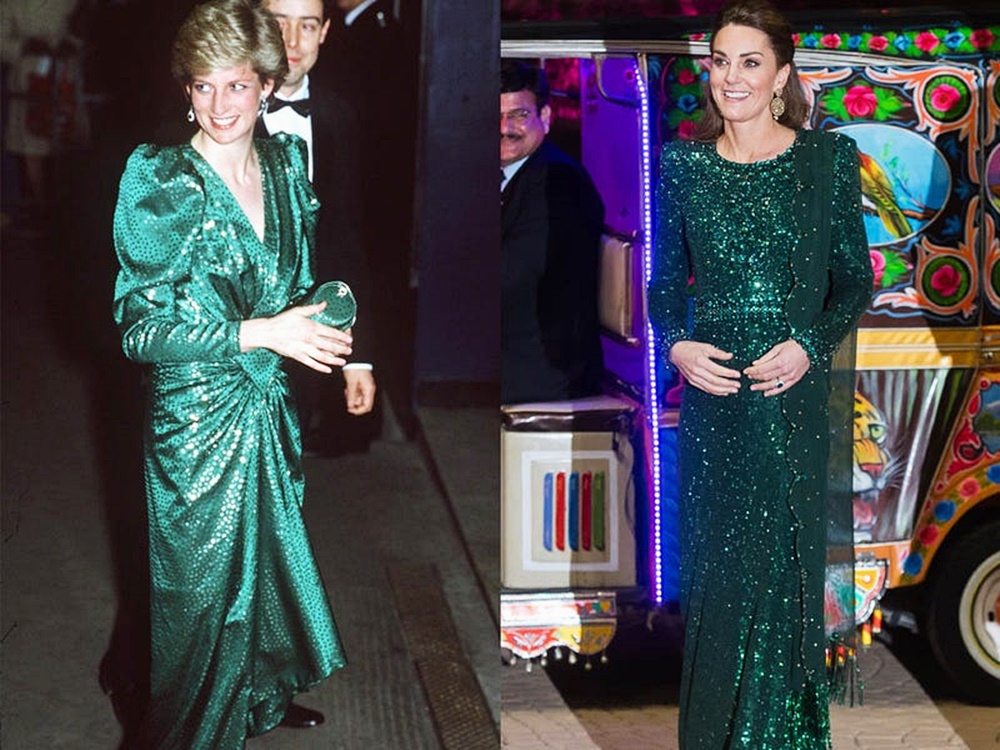 1986년 다이애나비는 한 자선행사에 반짝이는 에메랄드 가운을 입고 등장했습니다. 이 드레스는 벌룬 슬리브와 브이넥 네크라인이 특징적이었네요. 2019년 케이트 미들턴은 비슷한 드레스를 입었는데요. 단 소매는 더욱 슬림해졌으며, 더 깔끔한 라인을 자랑하고 있습니다.