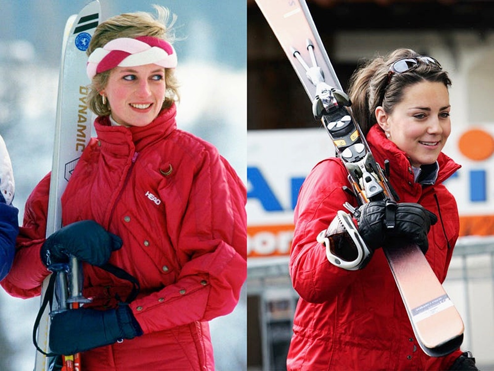 스위스 스키 여행을 떠난 케이트 미들턴의 모습입니다. 케이트 미들턴은 빨간색 스키 재킷을 입고 검은색 장갑을 끼고 스키 장비를 들고 있습니다. 이 모습은 케이트 미들턴이 윌리엄 왕자와 결혼하기 전 공개되었는데요. 이때부터 많은 영국인들은 케이트 미들턴과 고 다이애나비를 비교하며 많은 화제가 되었습니다. 다이애나비의 모습은 1986년에 찍힌 것인데요. 케이트 미들턴이 방문한 곳과 동일한 곳이며 트렌디한 헤드밴드를 착용해 더욱 트렌디해 보입니다.