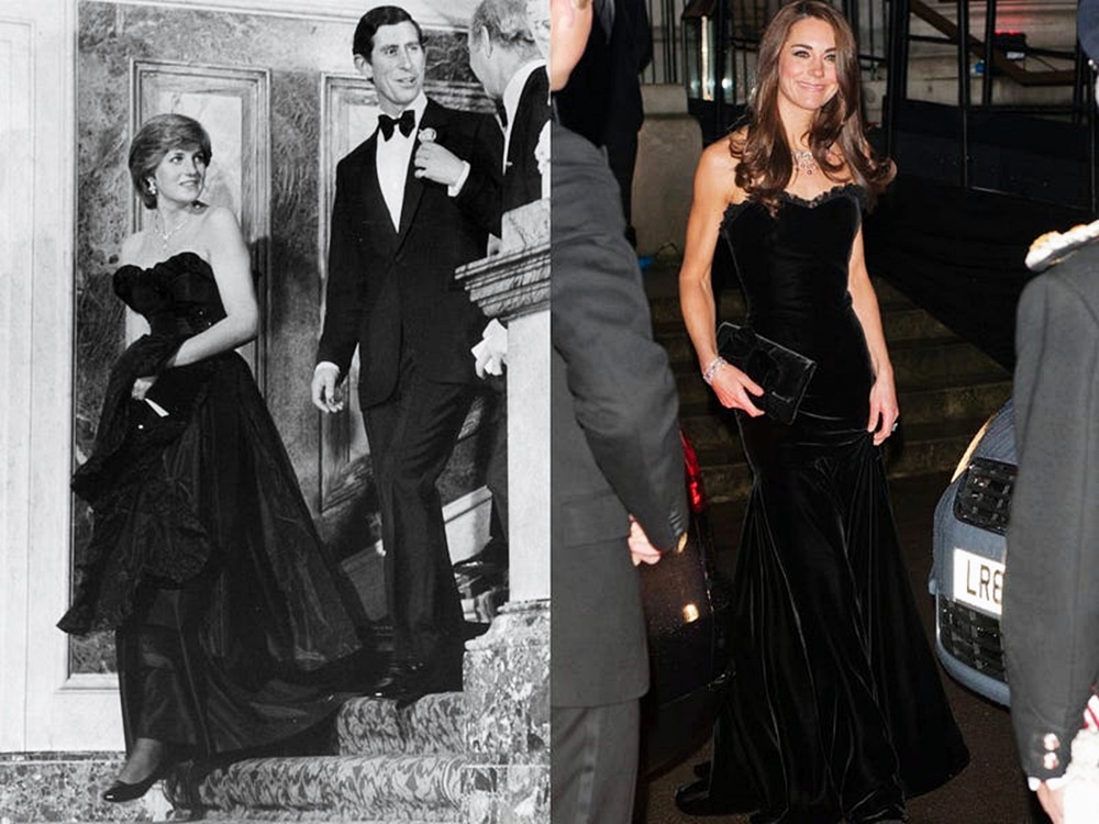 1981년 다이애나비는 찰스 왕세자와 함께 왕실의 일원으로서 첫 임무 수행에 나섰습니다. 이때 다이애나비는 스트랩리스 스윗하트 네크라인 디테일이 특징적인 블랙 가운을 입고 다이아몬드 액세서리를 매치했죠. 케이트 미들턴 또한 2011년 거의 비슷한 의상을 입고 다이아몬드 주얼리를 매치했네요.