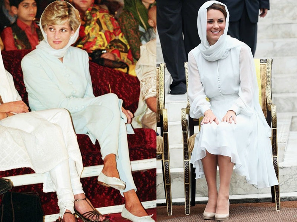 2012년 말레이시아를 방문한 케이트 미들턴은 베이비 블루 컬러의 헤드스카프와 비슷한 컬러의 원피스를 입었습니다. 이 의상은 다이애나비가 파키스탄을 방문했을 때 입은 의상과 비슷한데요. 다이애나비는 바지 정장을 입어 활동성을 더욱 강조했습니다.