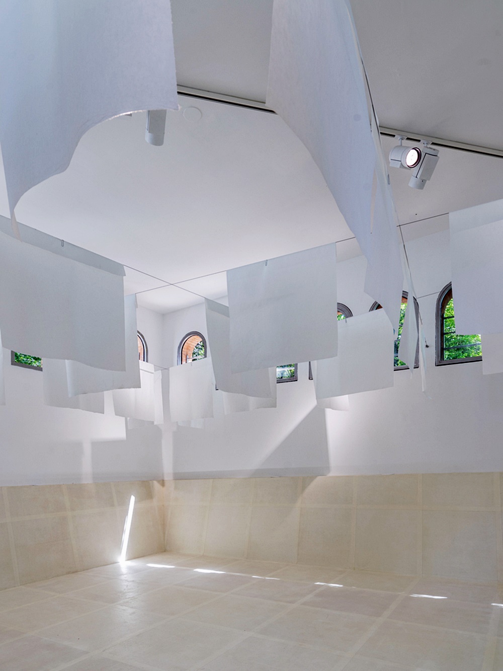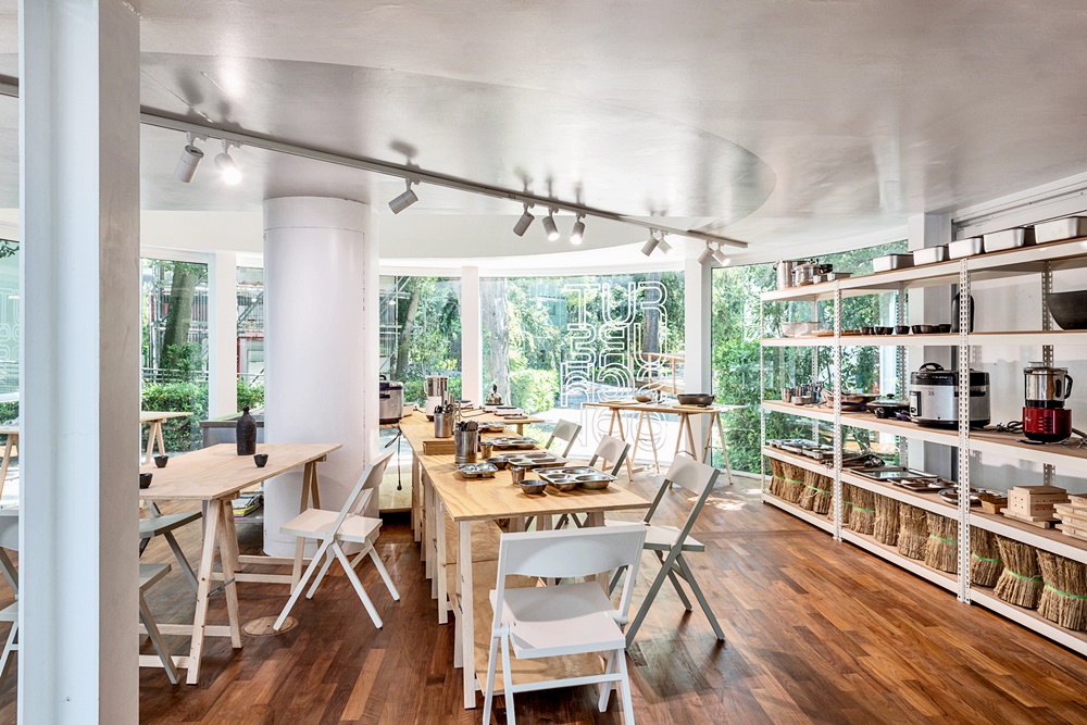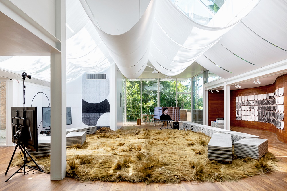 전통 한옥 건축에 영감을 받은 공간도 있습니다. 바로 한지 장판을 갖춘 한지방입니다. 이 공간은 기존의 벽돌 구조를 이용한 것이었습니다. 주방도 있습니다. 이곳에는 제주 옹기 컵이 갖춰져 있는데요. 이 제주 옹기 컵은 도예가 정미선이 디자인한 것으로 이곳을 방문하는 참가자들은 이를 이용해 차나 음료를 마실 수 있습니다. '프로세스 월'이라고 불리는 장소에는 235개의 A4 타일이 있는데요. 여기서는 '미래 학교'의 이전 워크숍과 대화 과정을 볼 수 있습니다.