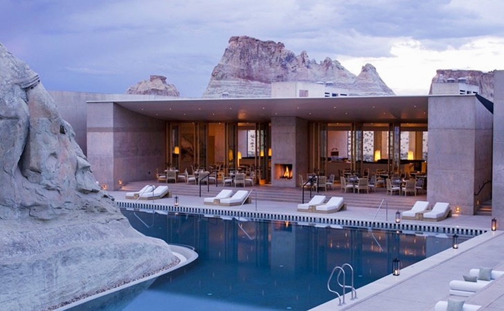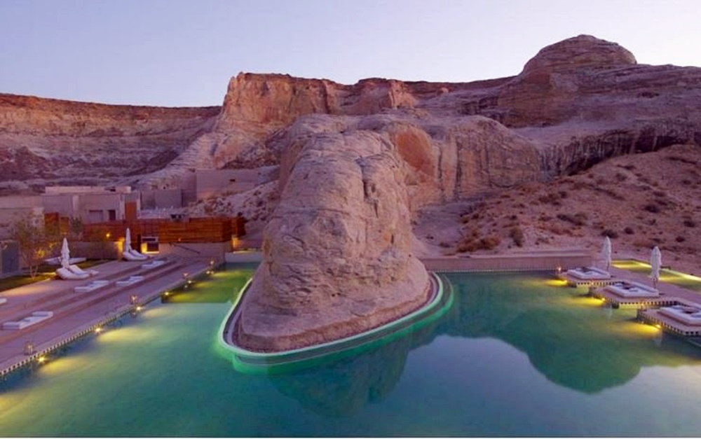 사막 한 가운데 신기루처럼 나타나는 이 수영장은 바로 미국의 캐니언 포인트에 있는 아망기리 리조트입니다. 이곳에 있는 수영장은 1억 6천5백만 년 된 거대한 암석 주위에 지어졌는데요. 암석을 훼손하지 않고 자연을 그대로 살려 독특하면서도 멋진 분위기를 자아내고 있습니다.