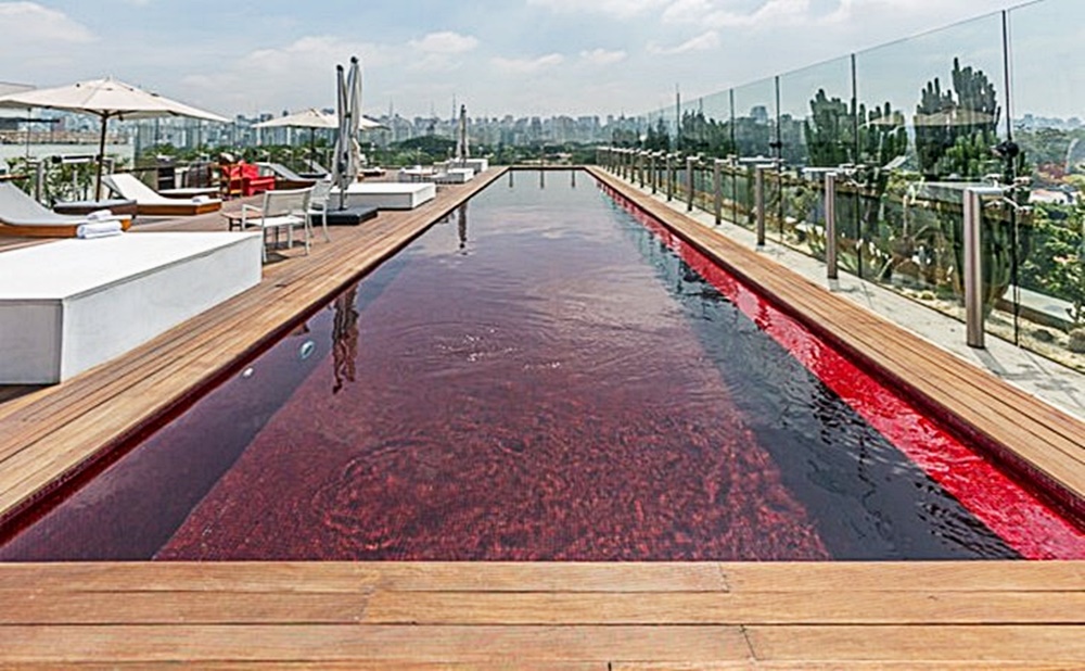 보통 수영장이라고 하면 청량한 파란색이나 하늘색을 떠올리는 경우가 많이 있습니다. 그러나 오늘 소개할 이 수영장은 전혀 다른 콘셉트로 만들어졌습니다. 바로 핏빛 수영장입니다. 물론 이 수영장의 물 색상이 그런 것은 아닙니다. 바로 바닥의 모자이크 타일 색상 때문이죠. 이 수영장은 브라질의 상파울루에 위치한 호텔 유니크의 8층에 위치하고 있는데요.