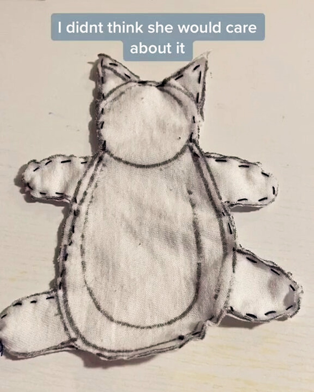 헤이즐은 사실 인형을 만드는데 그리 뛰어난 재주를 가지고 있지는 않았는데요. 이에 단순히 하얀 천을 고양이모양으로 두 개 잘라 꿰메었고, 안에는 솜을 넣었습니다. 이 인형은 전혀 고양이처럼 보이지 않았지만 헤이즐은 이 인형을 보자마자 즉시 사랑에 빠지고야 말았죠.