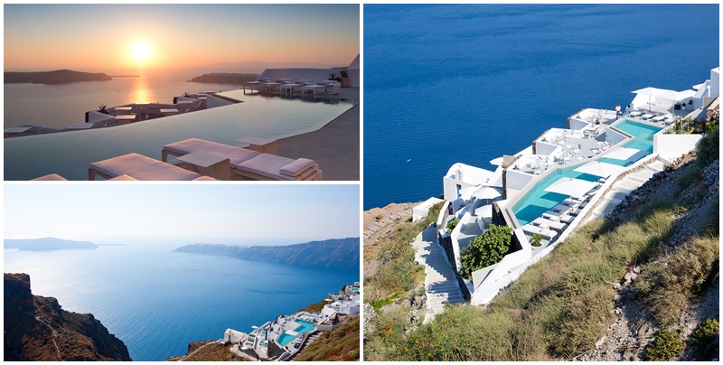 이쯤되면 산토리니가 드론 사진을 위해 이곳을 만들었다고 생각할 수밖에 없을 것 같습니다. 흰색 집들이 겹겹이 쌓여있으며 그 꼭대기에는 산토리니에서 가장 큰 인피니티풀이 있습니다. 해발 300미터에 자리하고 있는 이 수영장은 산토리니 '그레이스 호텔'에 있는 것입니다. 이곳에는 14개의 라운지 의자가 있으며 기하학적 모양 덕분에 많은 사랑을 받고 있습니다.