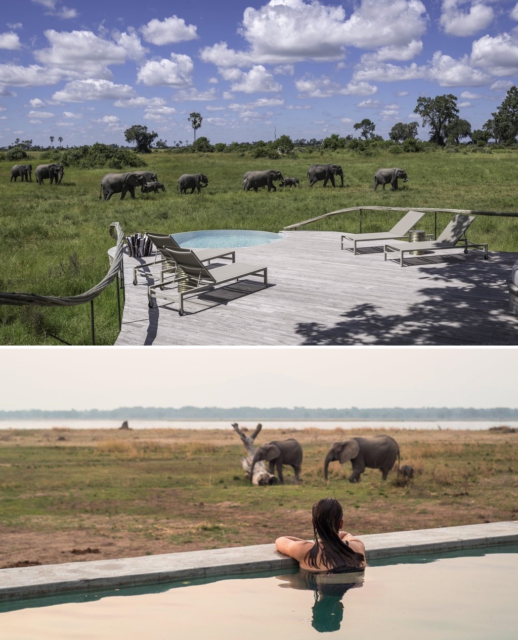 보츠나와의 오카방고 삼각주에는 '몸보(Mombo)'라는 이름을 가진 캠프가 있습니다. 한낮의 뜨거운 열기를 식히기 위해서는 수영장이 필수이나 이곳의 수영장은 조금 더 특별합니다. 바로 코끼리, 기린, 영양 등의 야생동물을 보며 프라이빗한 풀을 즐길 수 있다는 것이 그것입니다. 사방이 온통 탁 트여있는데 어떻게 프라이빗할 수 있냐구요? 이 근처에는 캠프가 이것밖에 없고 인적이 드문곳이라 이것이 가능하다고 하네요.